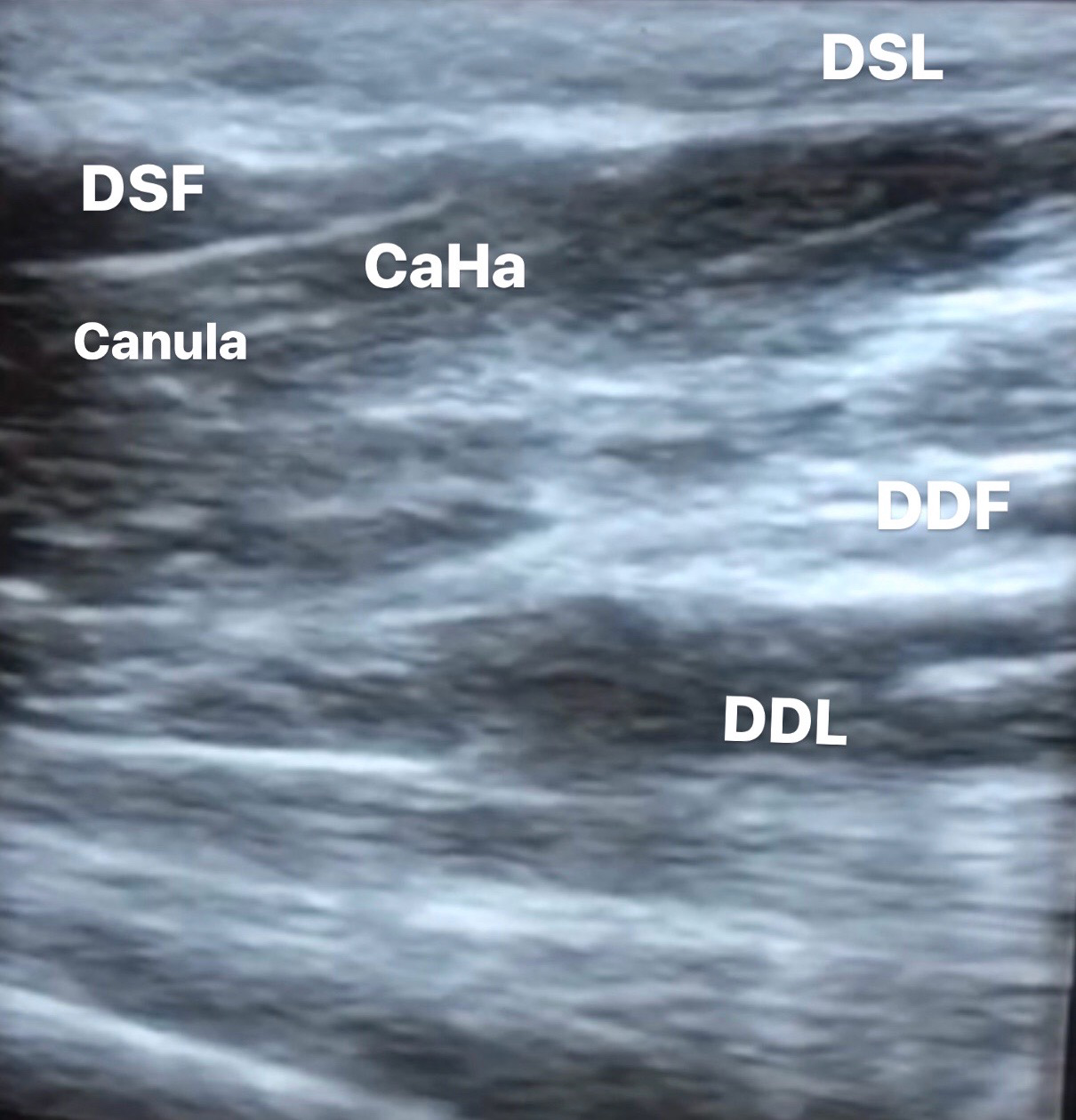 During the procedure, the filler injection was observed as a hyperechogenic with shadow image at superficial dorsal lamina through proximal-to-distal fanning technique and the layers was correctly visualized, ensuring a correct plane application.
