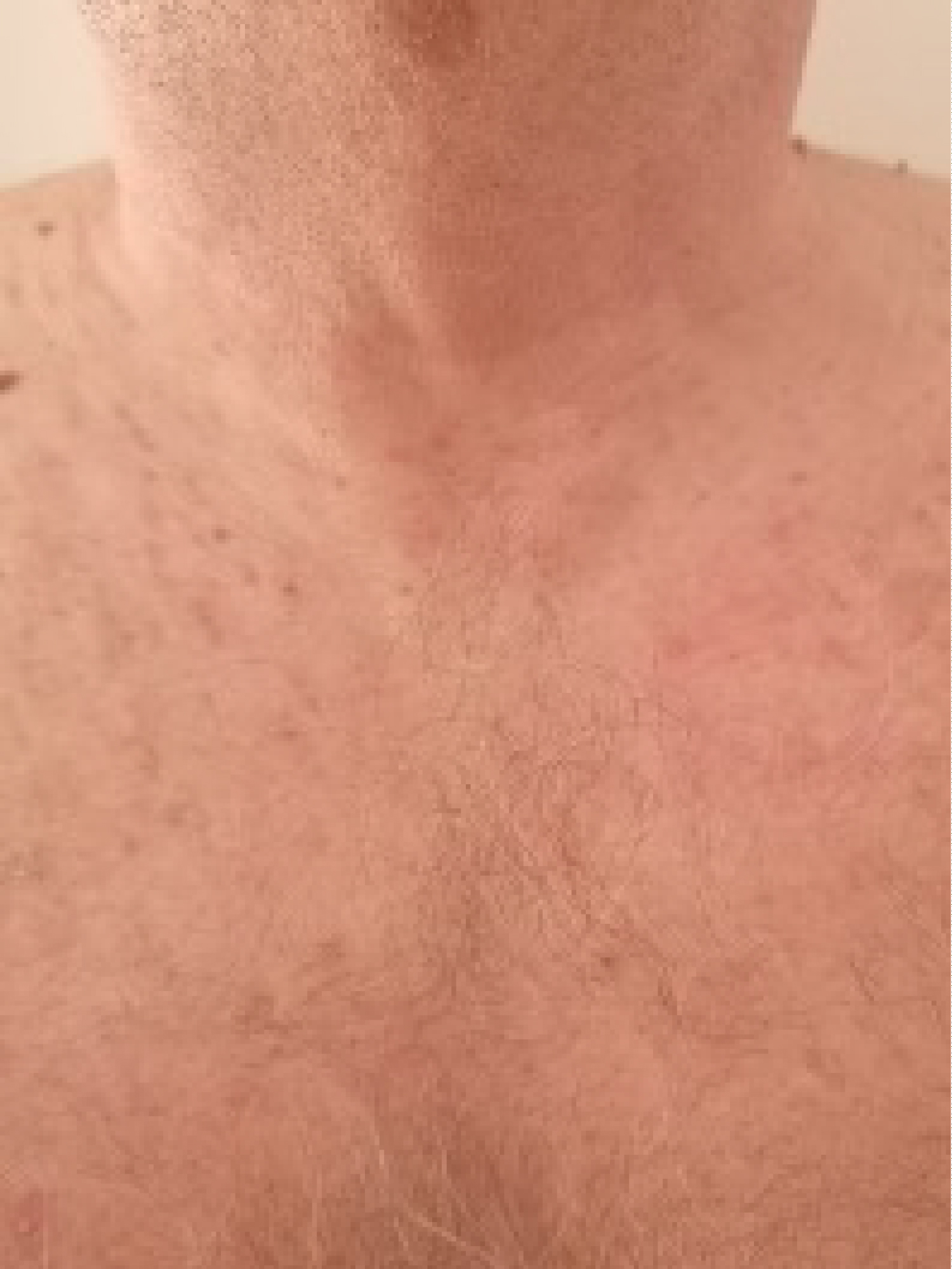 On day 10th after the positive swab test, during "symptoms-storm", he presented a no itching erythematous rash localized only at the trunk resembling chicken-pox. Patient was not assuming any medication.