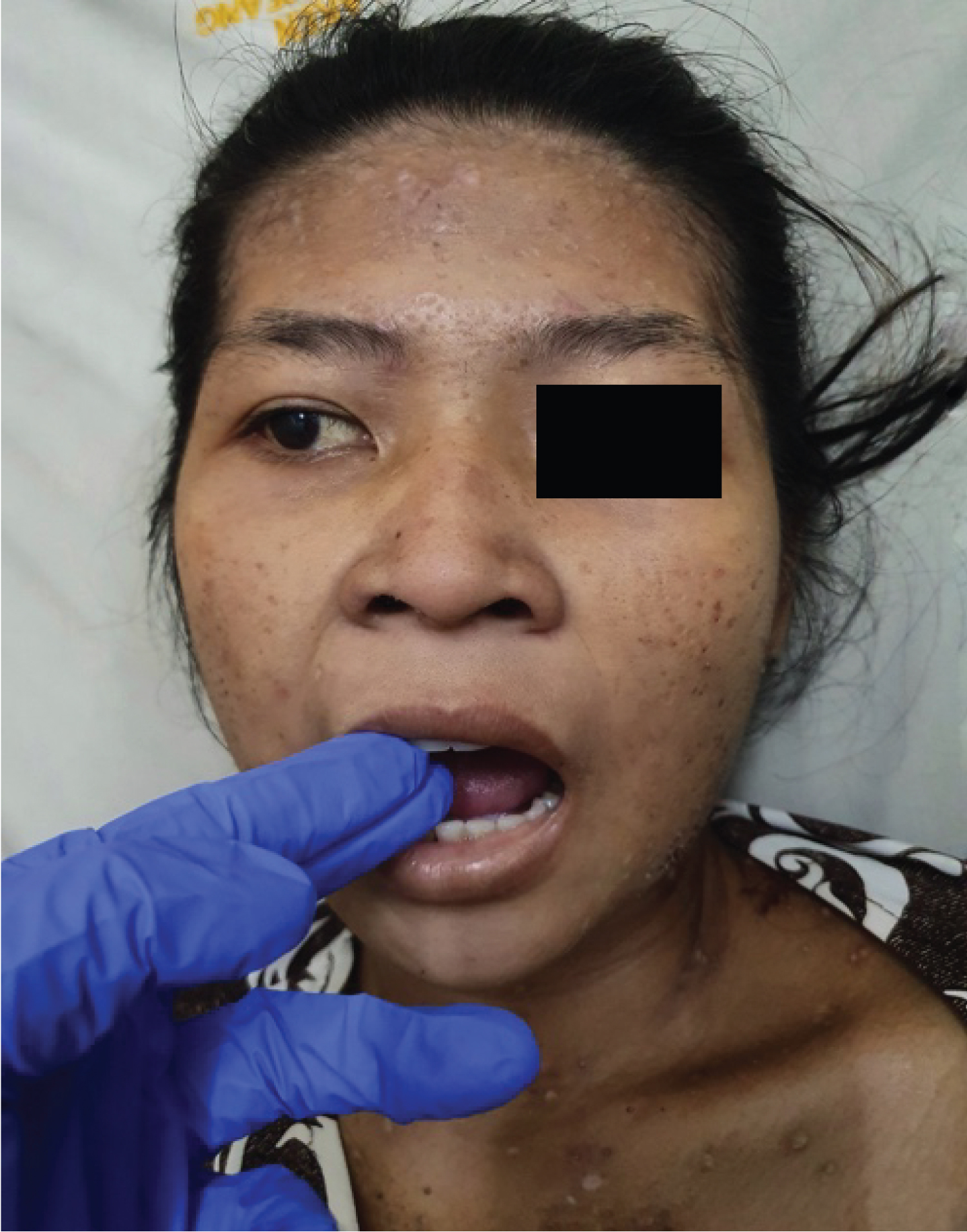 On physical examination, the general condition was moderate, compos mentis, with blood pressure 90/60 mmHg, pulse 97 beats/minute, respiration 20 times/minute, and temperature 36.8 °C. On oral examination, a 2-finger trismus was found so that the teeth and oral mucosa were difficult to assess. Generalized dermatological examination showed xerotic skin with ectomy in the coli region, bilateral forearms, chest, abdomen, back, and bilateral legs. There are multiple hyperpigmented macules, plaque, diffuse, confluent, and sclerotic palpable in the bilateral arm, chest, abdomen, bilateral limbs, and back. In the facial region of the pars frontal, bilateral pars mastoid, neck, bilateral arms, chest, stomach, back, legs, hypopigmented to hyperpigmented macules, multiple, circumscribed forming a "salt and pepper" image. Puffy fingers are found all over the fingers. The total mRSS was 40. The results of blood laboratory tests showed that the ESR was 90 mm/hour, C-Reactive Protein (CRP) was reactive, while other results were within normal limits. Serological tests for Rheumatoid Factor (RF) were positive, Antinuclear Antibody (ANA) was positive, Anti Scl-70 was positive (+). Postero-Anterior (PA) chest X-ray and electrocardiogram (EKG) within normal limits.