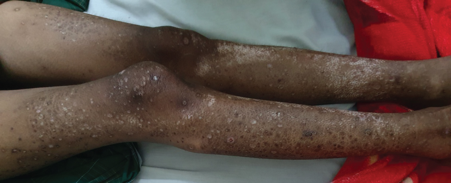 Figure 5: Photograph of both limbs. Diffuse sclerosis of the upper and lower limbs was seen with a "salt and pepper" pattern. Looks xerotic skin with multiple ectima.