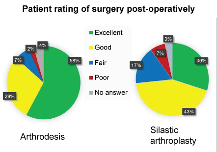 Figure 1: Patient satisfaction rating score post-operatively according to procedure performed (arthrodesis n = 45, silastic arthroplasty n = 30).
