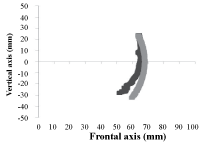 The toe flexion angle of 16 subjects was 32.8º (SD 12.4º). Figure 2 shows the ideal (an arc around the RMP with radius of the RMP-TOE distance at the start of flexion) and actual trajectories of the TT obtained in one trial of toe flexion movements performed by one participant. In 13 out of 16 participants, as the toe flexion angle increased, the actual trajectory moved farther from the ideal trajectory toward the inside of the graph. In the other three participants, as the toe flexion angle increased, the actual trajectory crossed the ideal trajectory or moved farther from it toward the outside. The IPF index was 8.6º (SD 3.4º) in 16 participants. There were no significant differences between males and females.