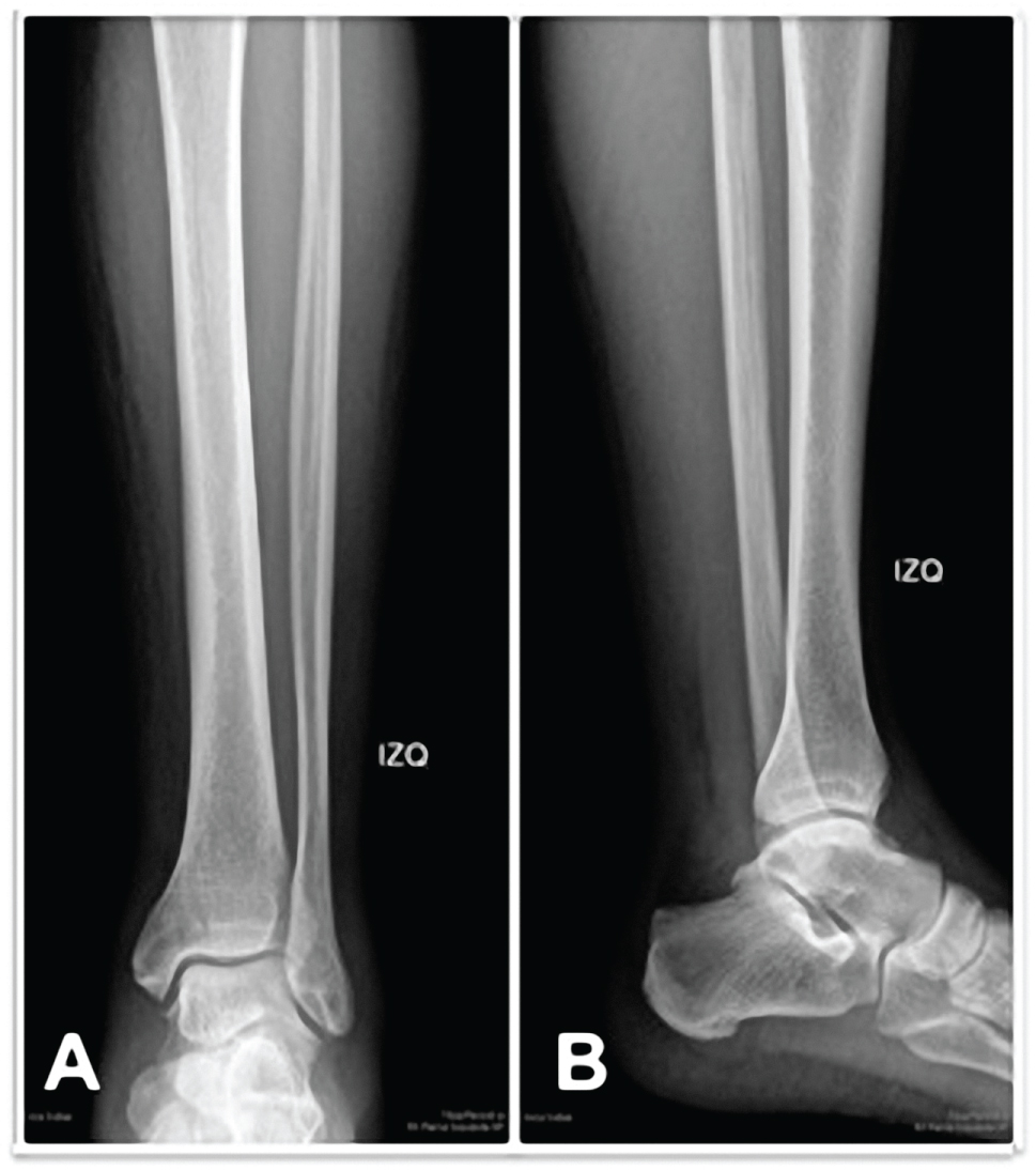 Figure 1: Ankle radiograph at presentation (A) anteroposterior view; (B) lateral view, Radiolucent line is seen in the medial malleolus. View Figure 1