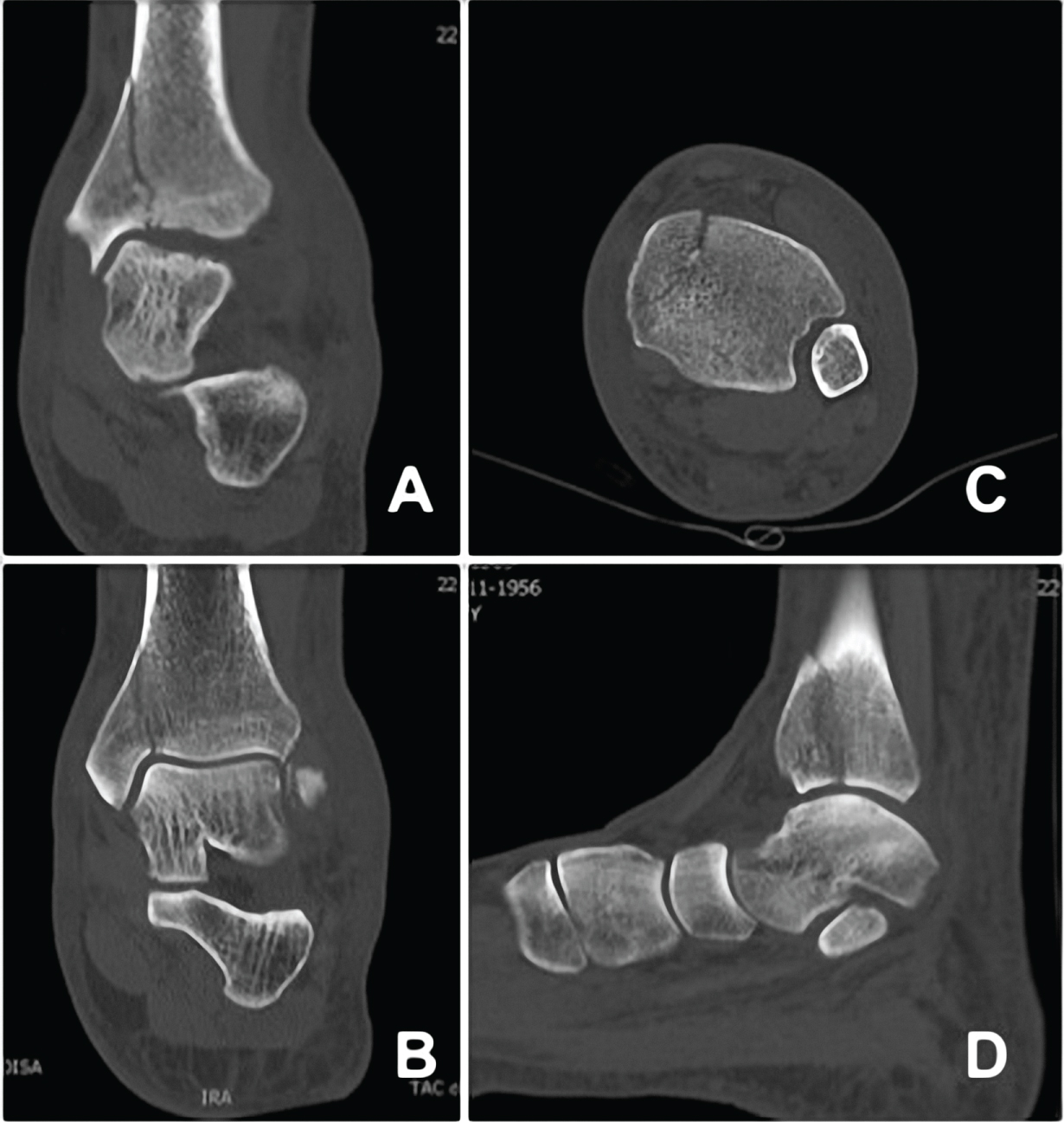 Figure 2: Ankle CT-scan at presentation (A-D), Confirming the diagnosis. View Figure 2