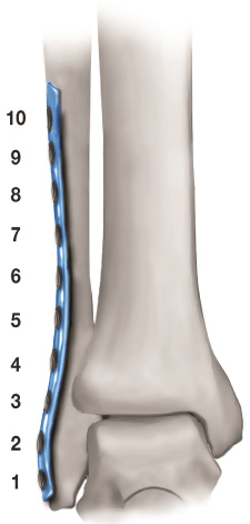 All patients were operated by the same surgeon. The lateral approach to the fibula under tourniquet control was utilized in all cases. Fractures were fixed using the small fragment fracture instruments, standard power drill, the standard small fragment 3.5 mm set; 2.5 mm drill bit, 3.5 fully threaded cortical screws and 3.5 cancellous screws. Cancellous screws have been used to the first 45 cases and cortical screws to the rest 91 cases. The one-third tubular plate was pre-bended to fit precisely and was applied directly lateral to the distal fibula by the standard AO method. Upmost effort was taken to achieve anatomical restoration of the fibula length and rotation in all patients. Proximal screws of the fibula had bicortical fixation grip strength while distal screws were placed unicortically in order to avoid screw penetration and injury to the joint cartilage. Torque-meter screw driver was not utilized during insertion of the screws. Depending on the fracture type and characteristics, lag or syndesmotic screw were used for the fixation of the fibula and the syndesmosis. During insertion, a percentage of the distal plate screws had reduced fixation grip strength. We did not tried to replace reduced fixation grip strength screws with larger core or different type screws and decided to leave them in place. Numbers were assigned for the plate holes and the screws placed, in sequential manner from one to ten (Figure 1), from distal to proximal fibula and we recorded which of them presented reduced fixation grip strength during their placement. The medial malleolus was fixed in standard technique using two malleolar screws. Fracture reduction was evaluated intraoperatively by radiographic control with C-arm, using the tibiofibular clear space, talar tilt and mortise width and was anatomic and satisfactory in all patients.