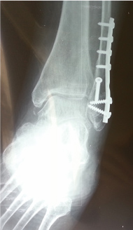 Postoperatively, all patients were placed in a below the knee cast. No bone densitometry measurement was performed since its results do not affect the used technique. Based on our findings, the outcome was invariable and independent of the use, either cortical or cancellous screw. Moreover, our observations were mainly focused on the technique. Fracture healing was assessed clinically and radiologically. First follow up visit was in fourteen days. At six weeks patients had a new radiological evaluation and were placed in a walking cast. They were instructed to begin gradual weight bearing at eight weeks after the surgery. Our treatment protocol was to removed all syndesmotic screws after six weeks. The majority of studies advocate to remove them after 8 weeks [6,7], but in this study we present our treatment protocol. At the tenth postoperative week and after consolidation of the fracture, all patients had their walking cast removed and begun ambulation with crutches for two further weeks. Criterion to our protocol for delayed union was the absent of consolidation of the fracture after three months.