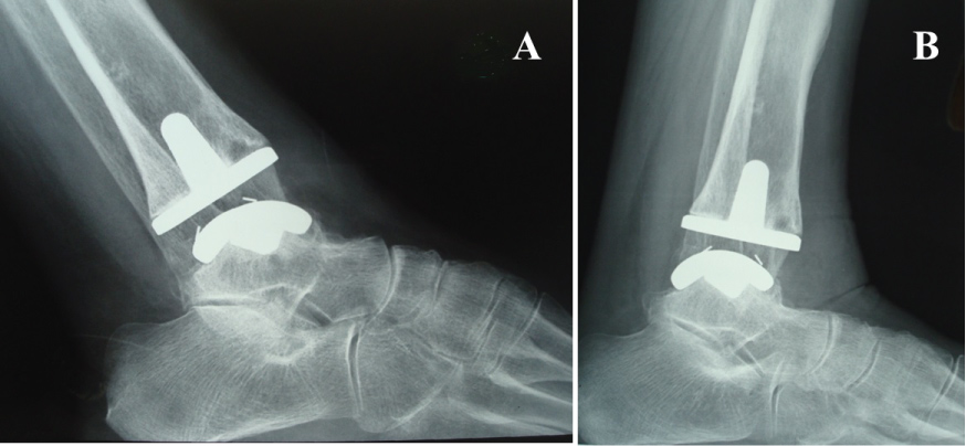 Figure 4: Radiographs showing subsidence of the talar component and radiolucency around the talar component. A) Lateral view; B) AP view. View Figure 4
