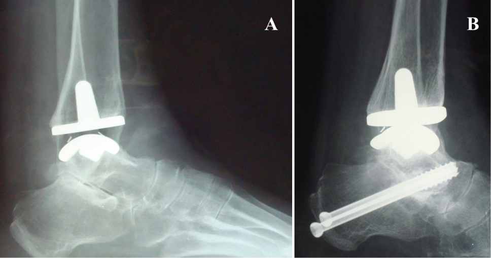 Figure 8: A) Subtalar joint osteoarthritis onset 1 year after TAR; B) Subtalar arthrodesis, iliac allograft, 2 screws. No cyst, no radiolucency, no subsidence. View Figure 8