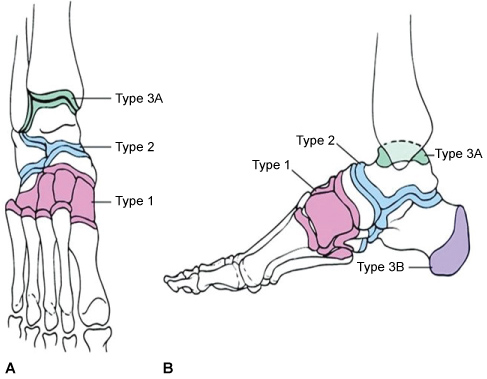 [12] reveal that the most widely used classification is the Brodsky anatomic classification of Charcot foot arthroplasty (Figure 1 and Table 1).