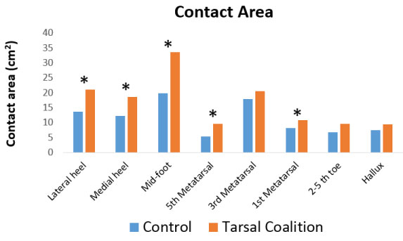 Figure 4: Comparison of the contact area between eight foot regions of subjects with tarsal coalition. View Figure 4