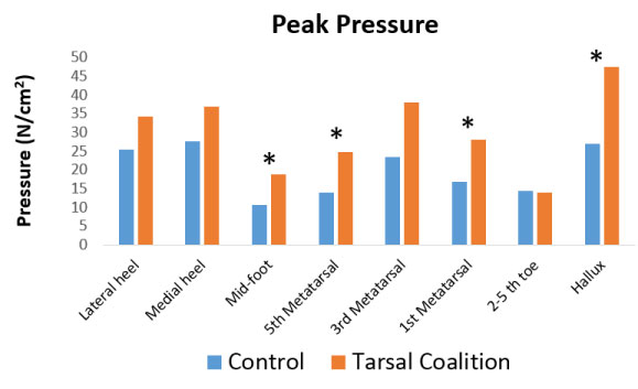 As a conclusion of this study, dynamic plantar pressure results of tarsal coalition feet showed significant differences compared to those of normal feet, showing malalignments of the hind-foot, midfoot and forefoot. The remarkable kinetic differences indicate that those biomechanical abnormalities of the foot impair the walking ability, which is necessary to use a foot orthotic to improve the alignment and function. It is essential to understand those pressure patterns in order to correctly select the orthotics. We recommend every patient to have a plantar pressure analysis during barefoot walking to evaluate the three foot segments and determine the optimal orthotic that reduces the hindfoot valgus, increases the mid-foot arch, and corrects the forefoot supination or pronation.