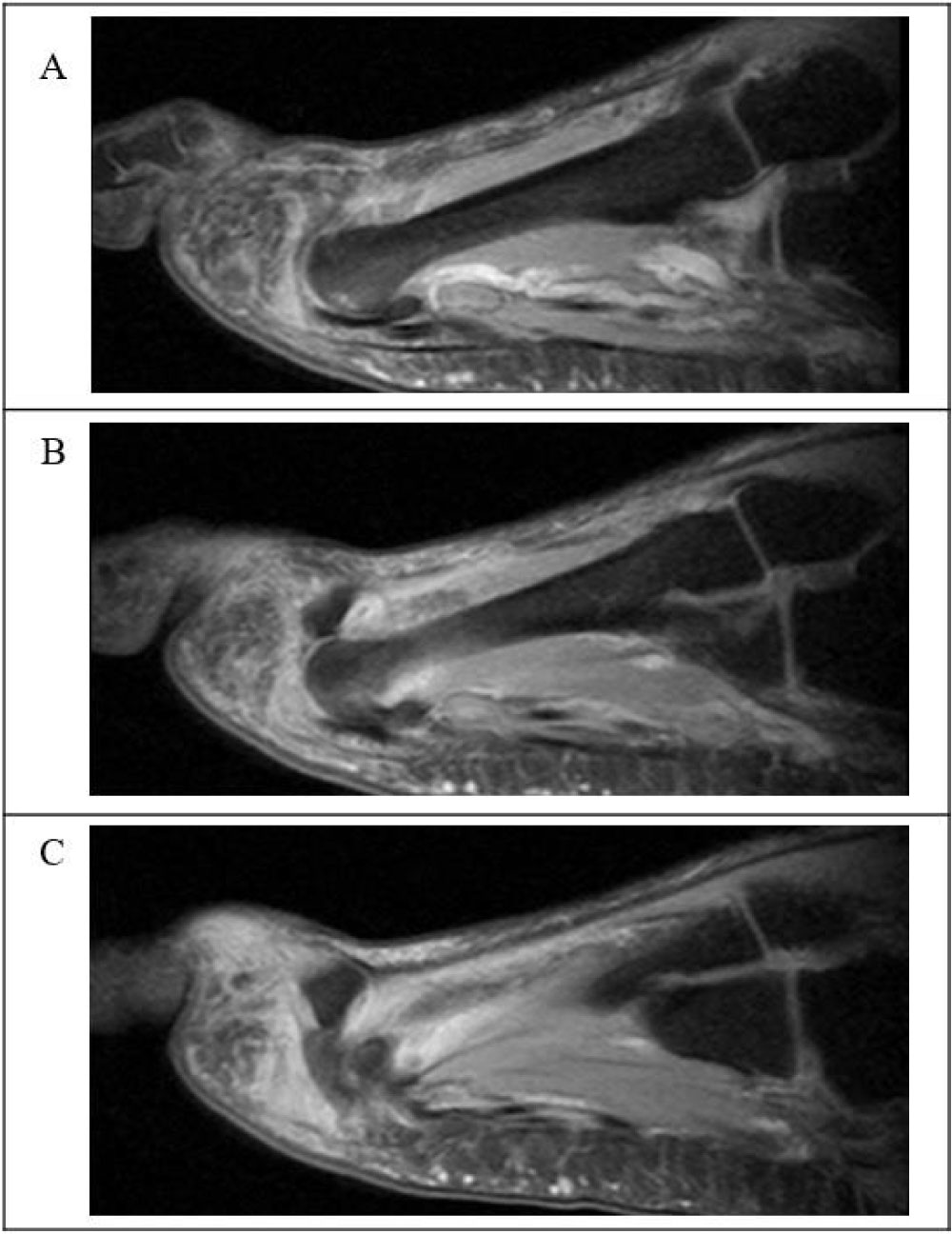 Figure 3: Preoperative MRI of the left foot showing the dorsal dislocation of the third MTP joint and a plantar plate tear. View Figure 3