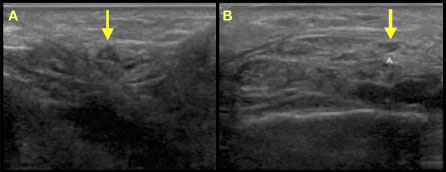 Figure 1: Ultrasonographic images of nerves localized: A) left superficial fibular nerve deep to fascia; B) left sural nerve lateral to Achilles' tendon. View Figure 1