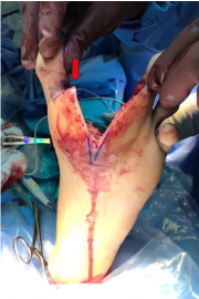 Figure 5C: Intra-operative image of surgical amputation and soft tissue debulking. Note, the skin flaps were left at the toes' edges for re-attachment and final closure. View Figure 5C