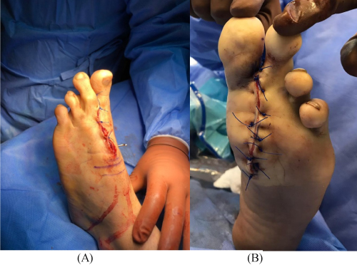 Figure 7: A) Intraoperative images after second toe amputation; B) fore-foot debulking and tentative skin closure. View Figure 7
