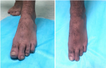 Physical examination upon presentation demonstrated left foot second toe enlargement with major discrepancy in shape of the left foot and second toe without significant deformity or mal-alignments (Figure 1A and Figure 1B). The medial column was stable in examination and the patient was maintaining symmetrical arch compared to the right foot. Range of motion at the second toe inter-phalangeal joints, Metatarso-phalangeal joint, and mid-tarsal joints were with in normal limits. The second toe was three times the length and five times the size of the toes in the same foot and the toes on the other foot. The ankle and hind-foot joints were comparable to the other foot with no significant abnormalities. The tibialis posterior and dorsalis pedis arteries were detected with clinical examination. The patient demonstrated intact sensations to light touch in all the areas of sensory distribution of the left lower extremity.