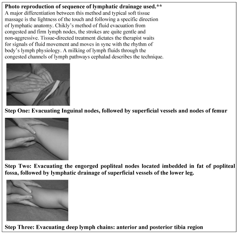 A major distinction of this method is the extreme lightness and non-aggressive touch and strokes to the lymph tissues the therapist employs and following a specific direction of lymphatic anatomy. Tissue-directed treatment dictates that the therapist waits for signals of fluid movement and moves in sync with the rhythm of the body's lymph physiology. It is an art form to learn though training is available for any profession. A milking of lymph fluids through the congested channels of the lymph node pathways cephalad describes the technique. Deep tissue massage or mobilization was not used in this case.