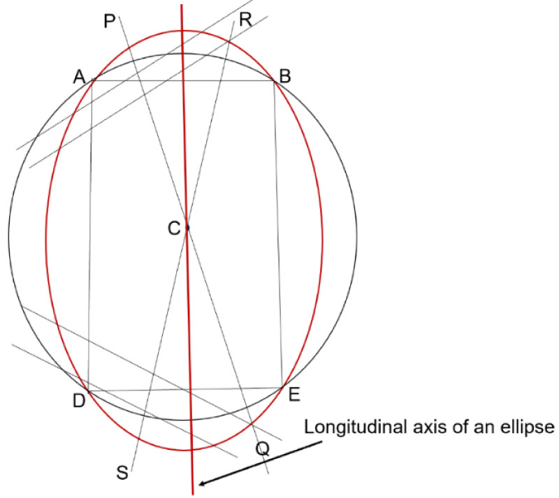 To determine the longitudinal axis of an ellipse with a compass and a ruler, one needs to follow the rules of coordinate geometry as depicted in Figure 3. (1) the lines (PQ and RS) bisecting two pairs of parallel chords on any points of the ellipse will intersect at the centre (C) of the ellipse. (2) The centre (C) of the ellipse is also the centre of a circle which intersects the boundaries of the ellipse at points A, B, D and E. (3) Points ABDE are the vertices of a rectangle (or a square depending on the size of the circle). (4) Bisecting either of the two shorter sides of the rectangle is a line that forms part of the longitudinal axis of the ellipse [7].
