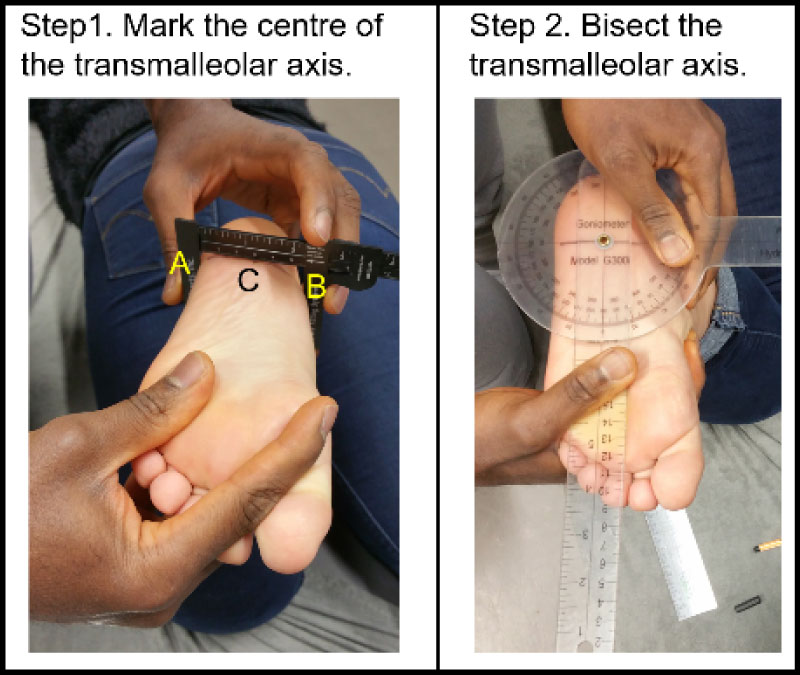 The procedure for transmalleolar axis bisector (TMAB) is depicted in Figure 4. The patient is in prone lying with the knee of the lower limb of interest in 90° flexion. The assessor approximates the weight bearing posture of the foot by maintaining a plantigrade ankle joint. Then, with a pair of Vernier callipers, a line (AB) is drawn on the heel, linking the most medial point (A) on the medial malleolus to the most lateral point (B) on the lateral malleolus. Before dispensing with the Vernier callipers, the assessor must also mark the midpoint (C) on the line AB. The final part of the procedure is to use a goniometer on the heel with the axis on point C, the stationary arm aligned with line AB and the movable arm of the goniometer at 90° to the stationary arm. The movable arm of the goniometer thus becomes the TMAB i.e. a line perpendicular to and traversing the midpoint of line AB. The assessor finishes the procedure by checking the point at which the TMAB crosses the metatarsals heads. The outcomes may be recorded as; second interdigital web space (2nd IWS), third digit (3rd D), third interdigital web space (3rd IWS) etc. The TMAB depicted in Figure 4 crossed the metatarsal heads on the 4th digit. This is not intended to indicate population norm.