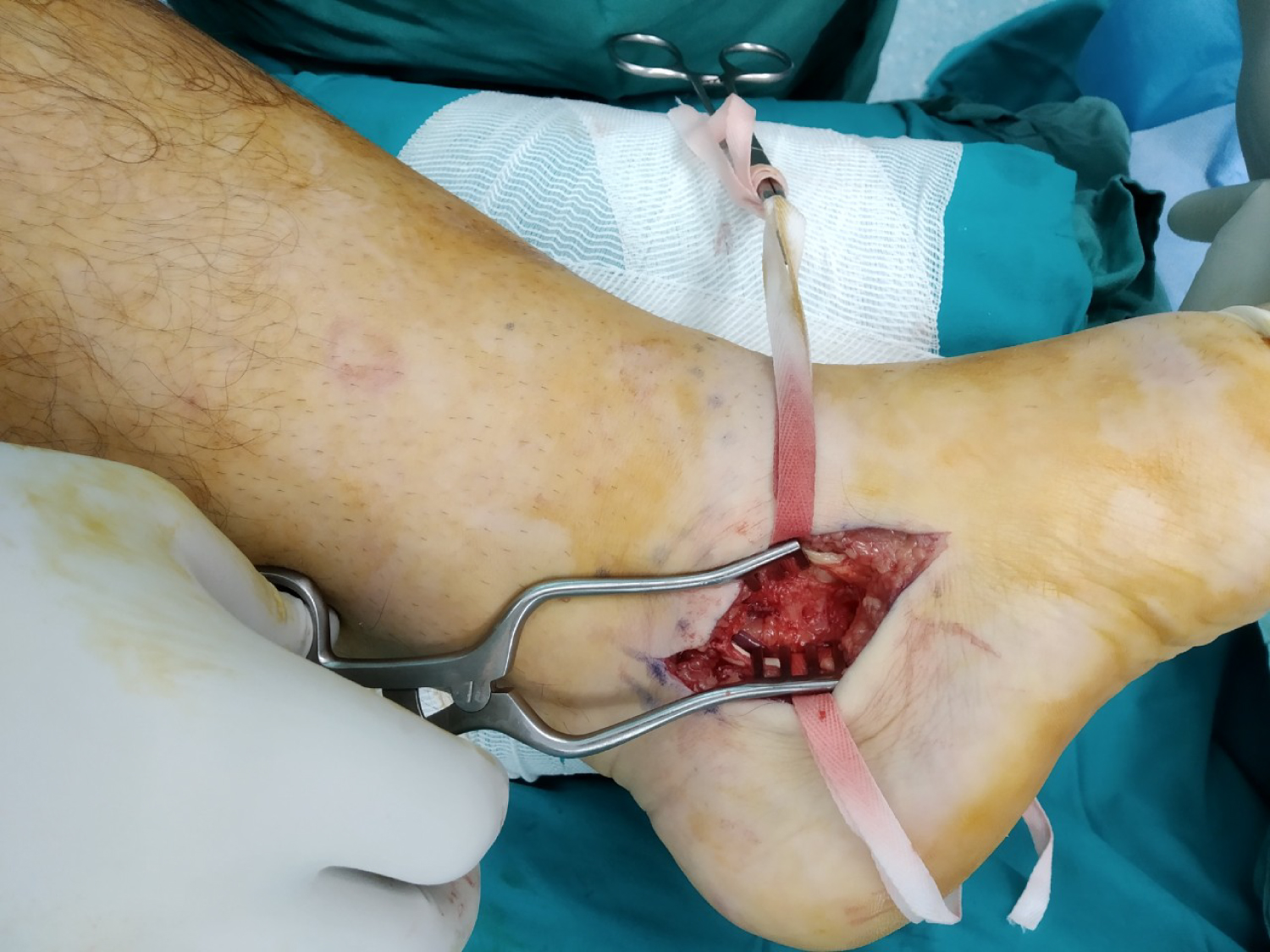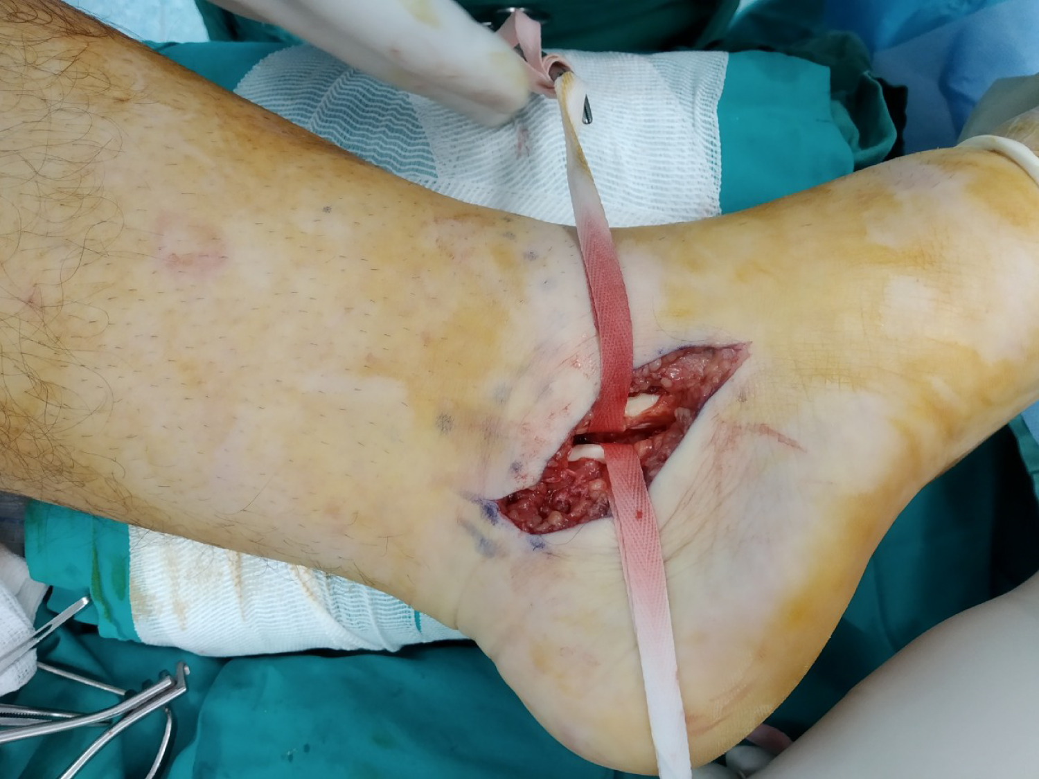 Figure 6: Intraoperative view. Surgical plan between tibialis posterior and flexor digitorum longus tendon.