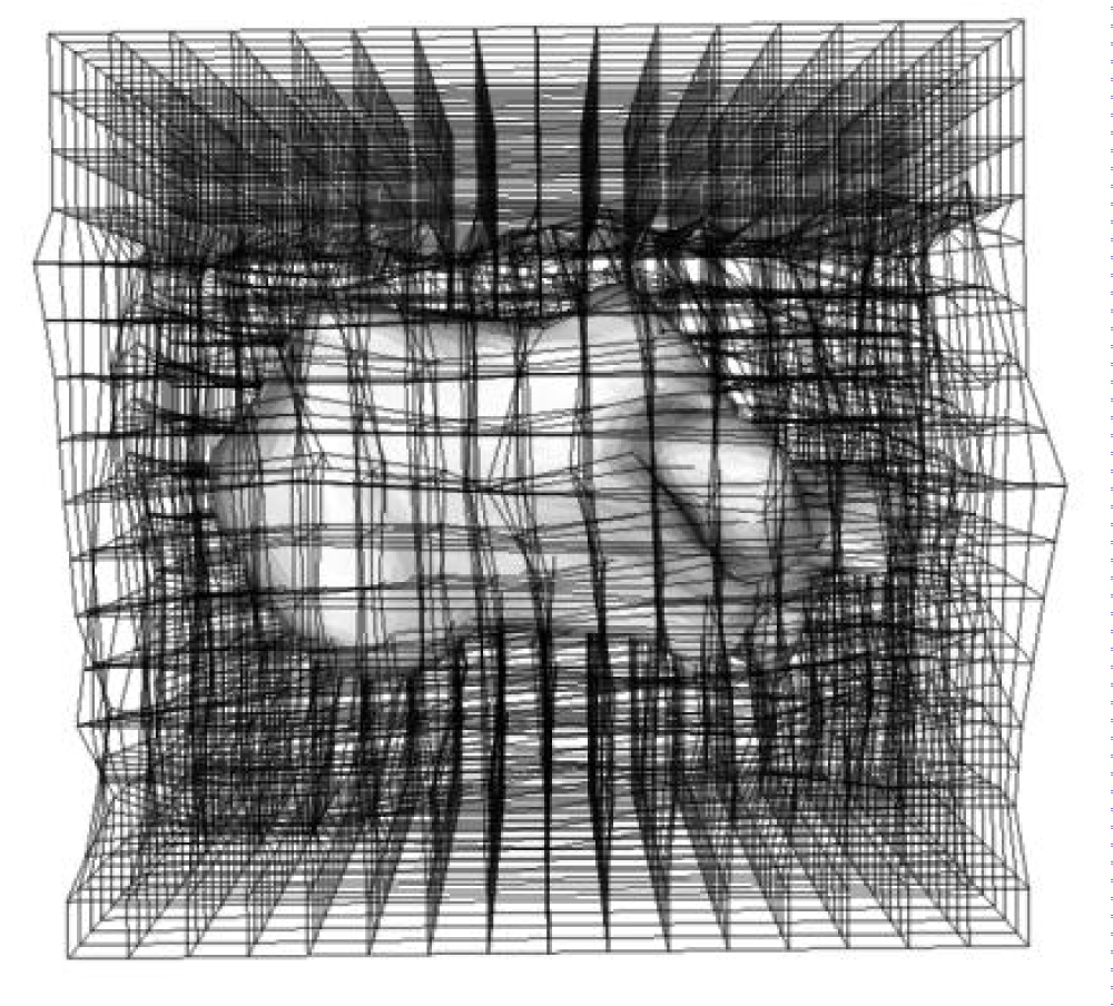 Figure 1: The state of the deformation field. The deformation field is represented by a grid-like three-dimensional space figure. The deformation field is composed of control points. Since the used image data has a volume size of 128 × 128 × 128 [voxel], the number of control points is 4913 (17 × 17 × 17), and the total degree of freedom is 14739.