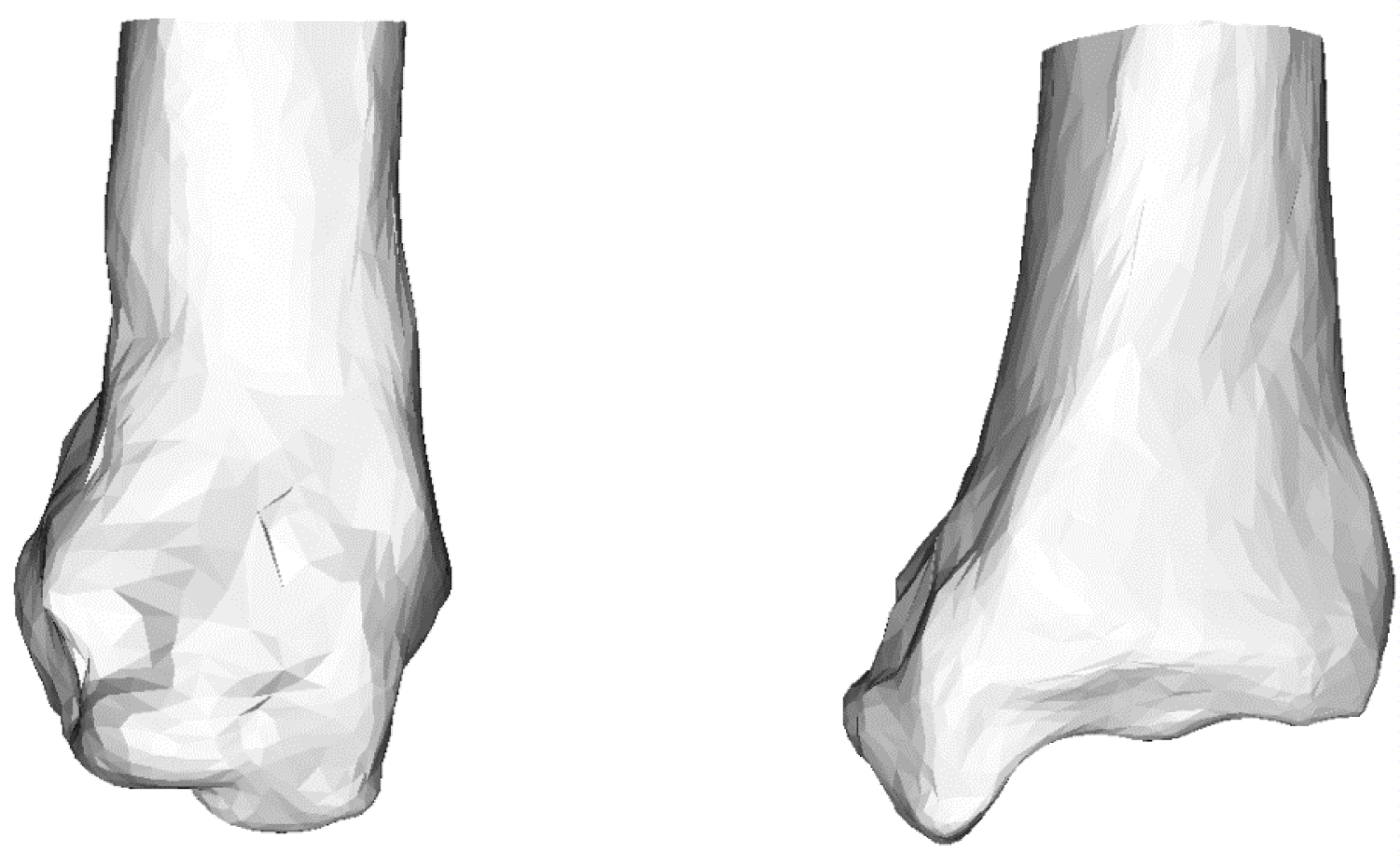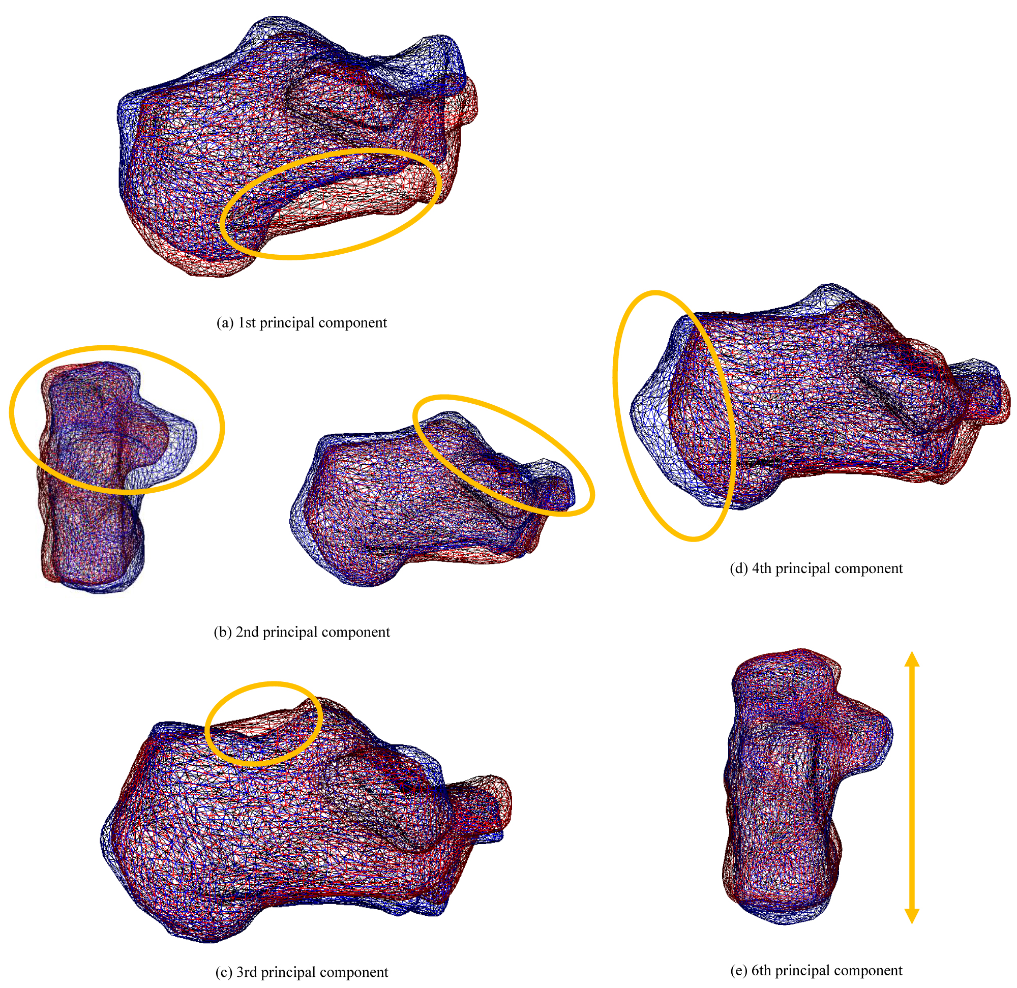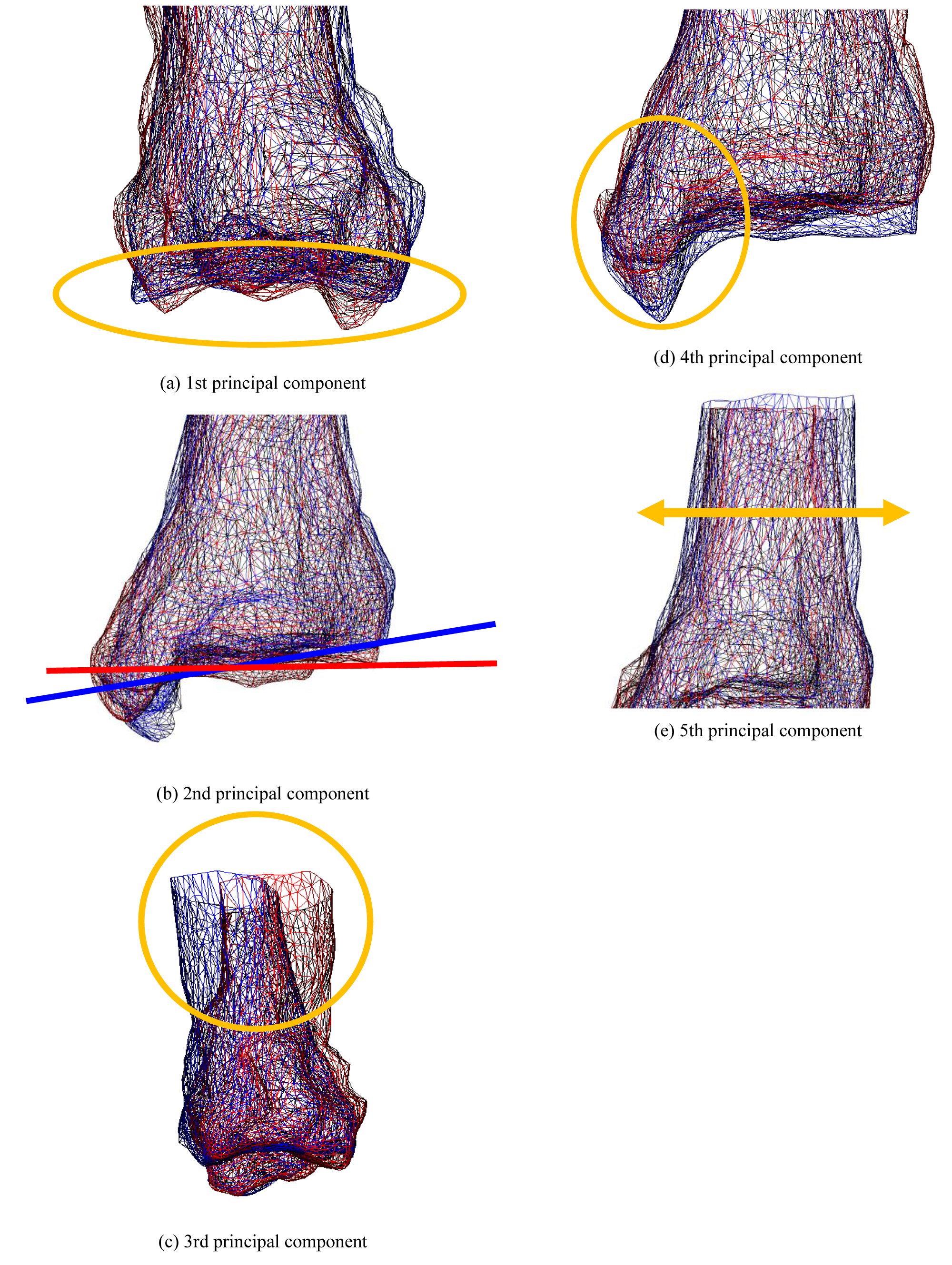 The weighting factor was set to +2σi or −2σi to highlight the differences in the features. σi is the standard deviation of the i-th principal component score. Consequently, some features, as shown in Figure 5, were identified, where (A) Is the first principal component corresponding to the canopy surface, (B) Is the second principal component corresponding to the curvature of the coronal plane, (C) Is the third principal component corresponding to the curvature of the sagittal plane, (D) Is the fourth principal component corresponding to the articular surface of the medial malleolus, and (E) Is the fifth principal component corresponding to the thickness of the tibia. However, these remarkable results include various shape features. In addition, as the shape characteristics of the sixth and seventh principal components cannot be described briefly, this will not be included in this article.