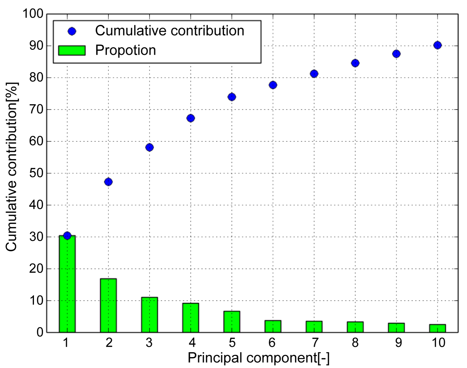 Figure 7: Cumulative contribution (Talus). Cumulative contribution rate exceeded 80 [%] up to the seventh principal component. Therefore, use up to the 7th principal component.