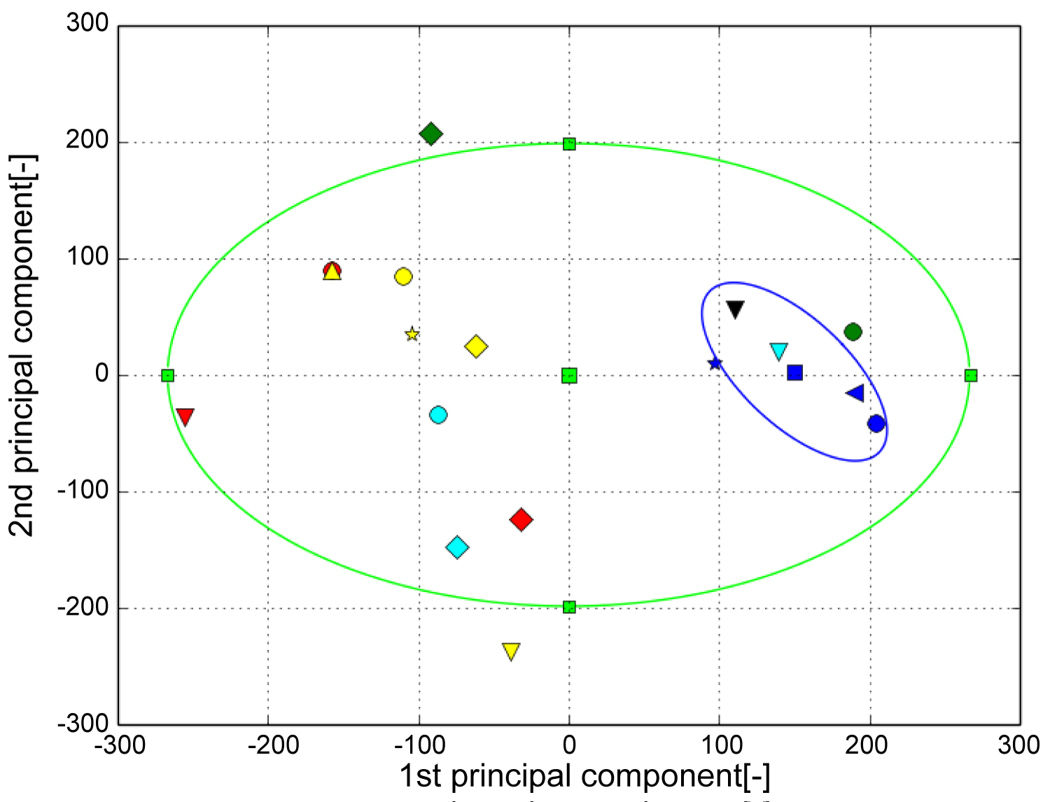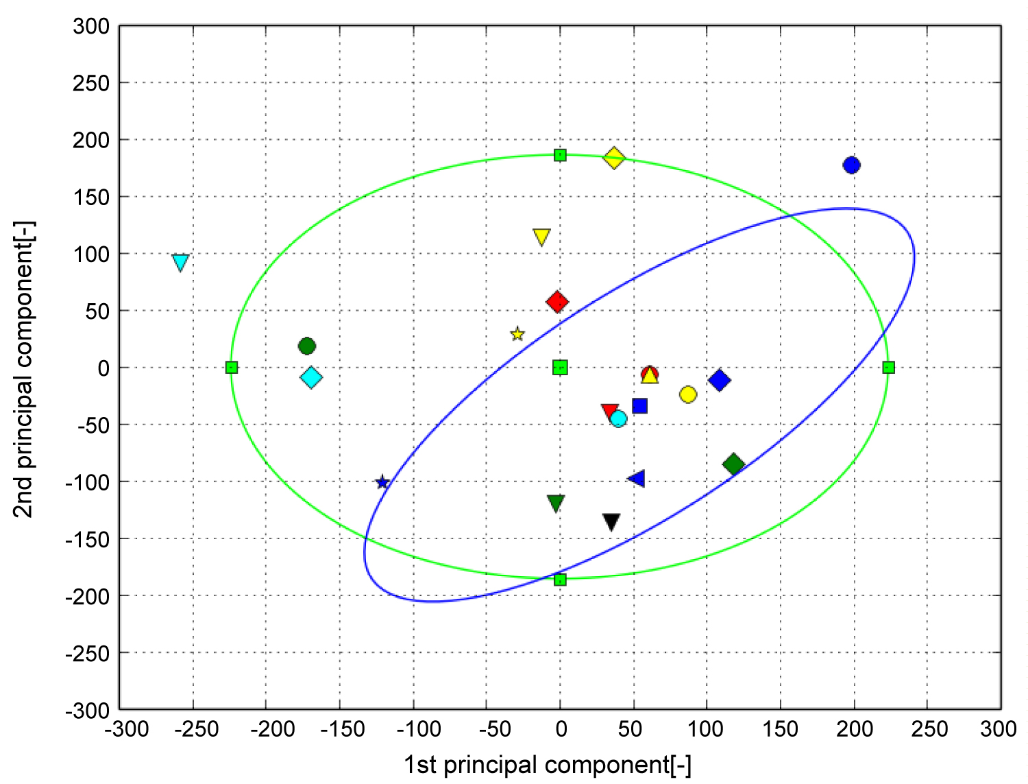 Figure 6: The result of PCA (Tibia). The horizontal axis represents the first principal component and the vertical axis represents the second principal component. The green ellipse is the probability ellipse and indicates the area that occupies 95% of all subjects, and the blue ellipse indicates the area that occupies 95% of healthy subjects. Blue is healthy, Black is Stage 1, Green is Stage 2, Light blue is Stage 3A, Yellow is Stage 3B, Red is Stage 4.