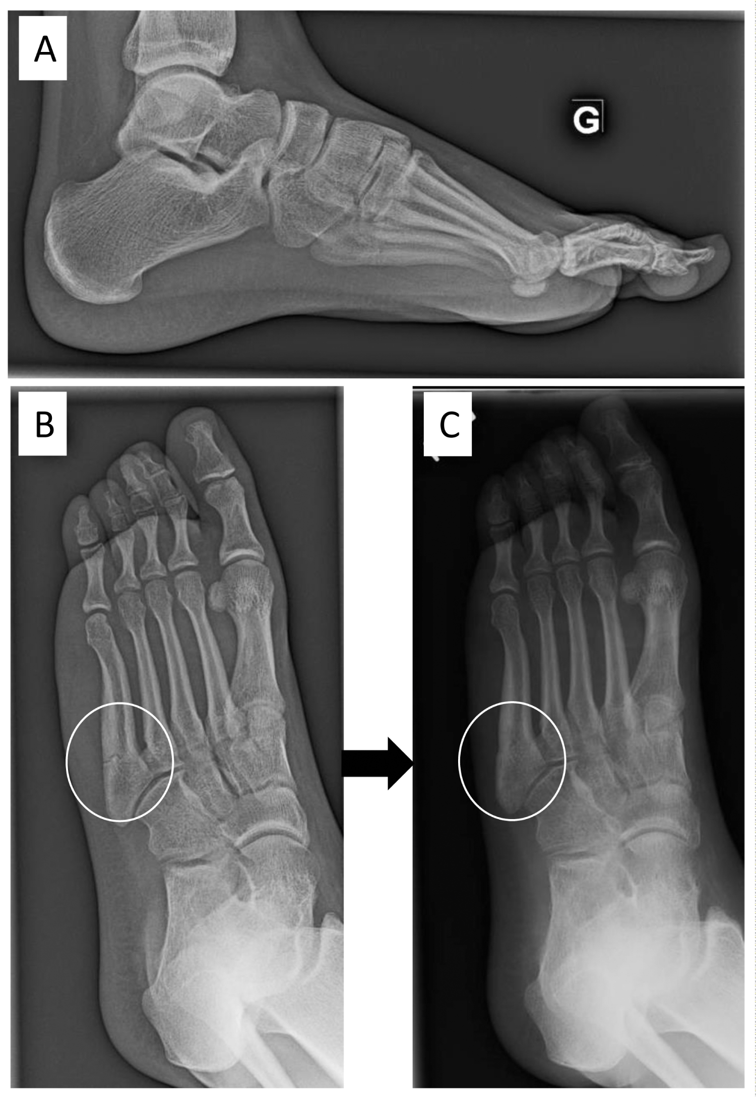 Figure 8: A 16-year-old female soccer player with a fracture of the 5th metatarsal in her left foot. She was treated with a non-weight bearing cast for 2 months, and progressively returned to sport. The same month, she fractured her 5th metatarsal bone (A, B). She wore a cast again and slowly healed. After 3-months, her subtle cavovarus foot was corrected with an insole. (C) After 6 months, she was clinically asymptomatic, returned to soccer with an insole and did not re-fracture.