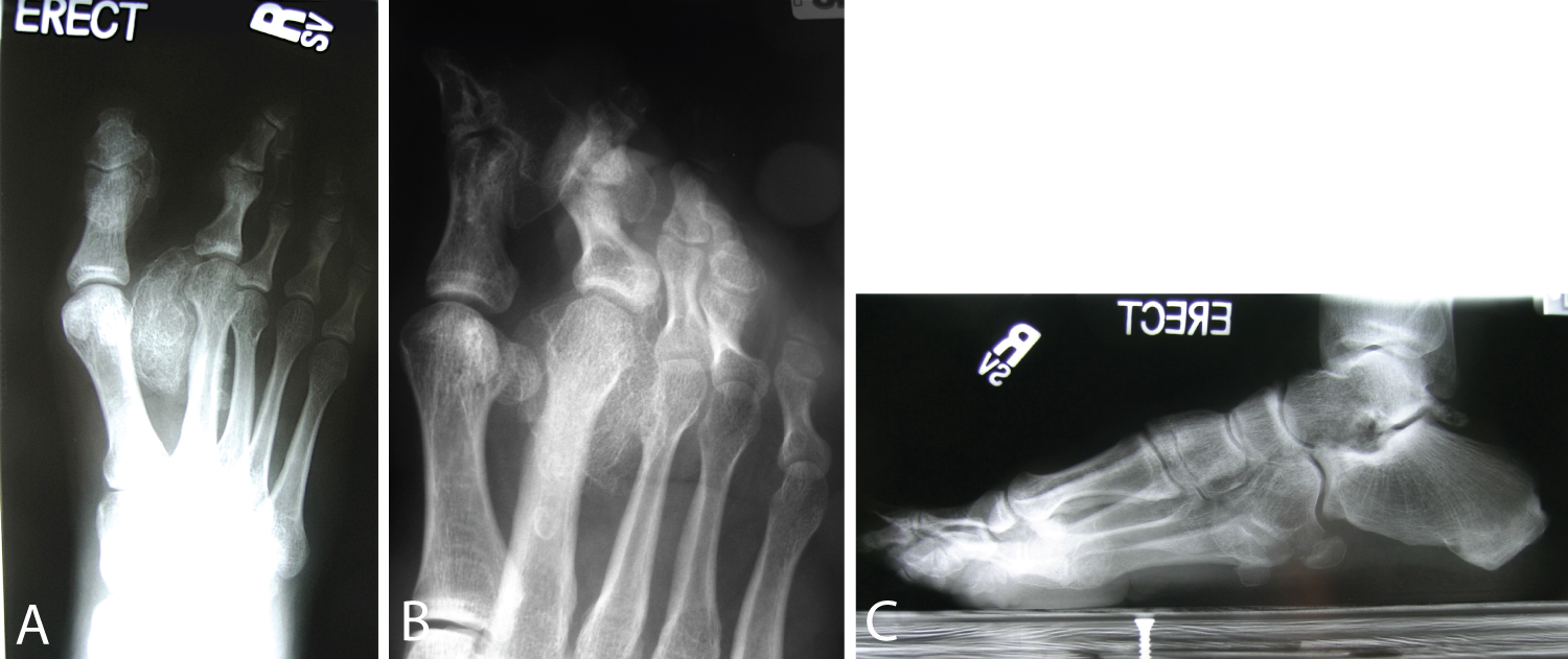 Treatment of the above foot deformity with heterotopic ossifications is not straightforward. Initially, due to the patient's hopes of continuing to play soccer and due to her intense class schedule, the patient elected to use custom full length total contact inserts with relief channels to offload bony prominences and shoe wear modifications including high top type of shoes or men's shoes. She was able to return to her soccer participation for a period of time with cleat adjustments and multiple pairs of orthotic inserts. However, three years later, her symptoms recurred and prevented her from competing at her desired level and pain was progressing even with daily activities or light exercise. At this point, the discussion of surgical treatment took place including the following options: First webspace heterotopic bone removal only, second ray amputation, transmetatarsal amputation (due to other lesions present), or below knee amputation. It was evident that heterotopic ossification was encasing the neurovascular bundles supplying the second toe, making an isolated mass excision likely to render the second toe dysvascular or non-functional, ultimately necessitating future amputation. After a thorough review of the advantages and disadvantages of each surgical intervention, second ray amputation with removal of the accompanying heterotopic ossification was chosen to achieve the goal of functional preservation and creation of a more shoeable and plantigrade foot. Due to the large area of heterotopic ossification, the patient was instructed that surgical procedures would be staged to minimize chance of neurovascular injury and wound healing complications.