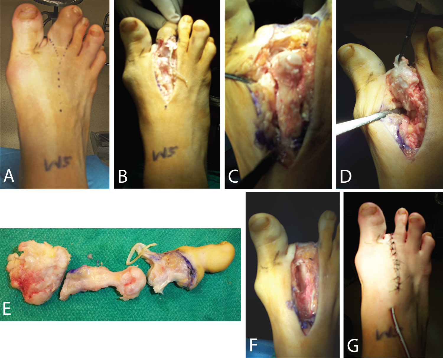 Figure 3: Illustrations of surgical technique for second ray amputation and removal of large heterotopic ossification in first webspace: (A) Racquet-shaped surgical incision outlined, (B) Neurovascular bundles to the second toe identified with artery ligated and digital nerve sharply transected, (C) Level of second metatarsal osteotomy identified, (D) Second metatarsal osteotomy completed in the proper orientation with heterotopic bone mass seen, (E) Second toe specimen prepared and sent to pathology, and (F) Residual space in between the first and third metatarsal shafts then (G) Reduced utilizing nonabsorbable suture passage around first and third metatarsals with placement of deep drain and skin closure.