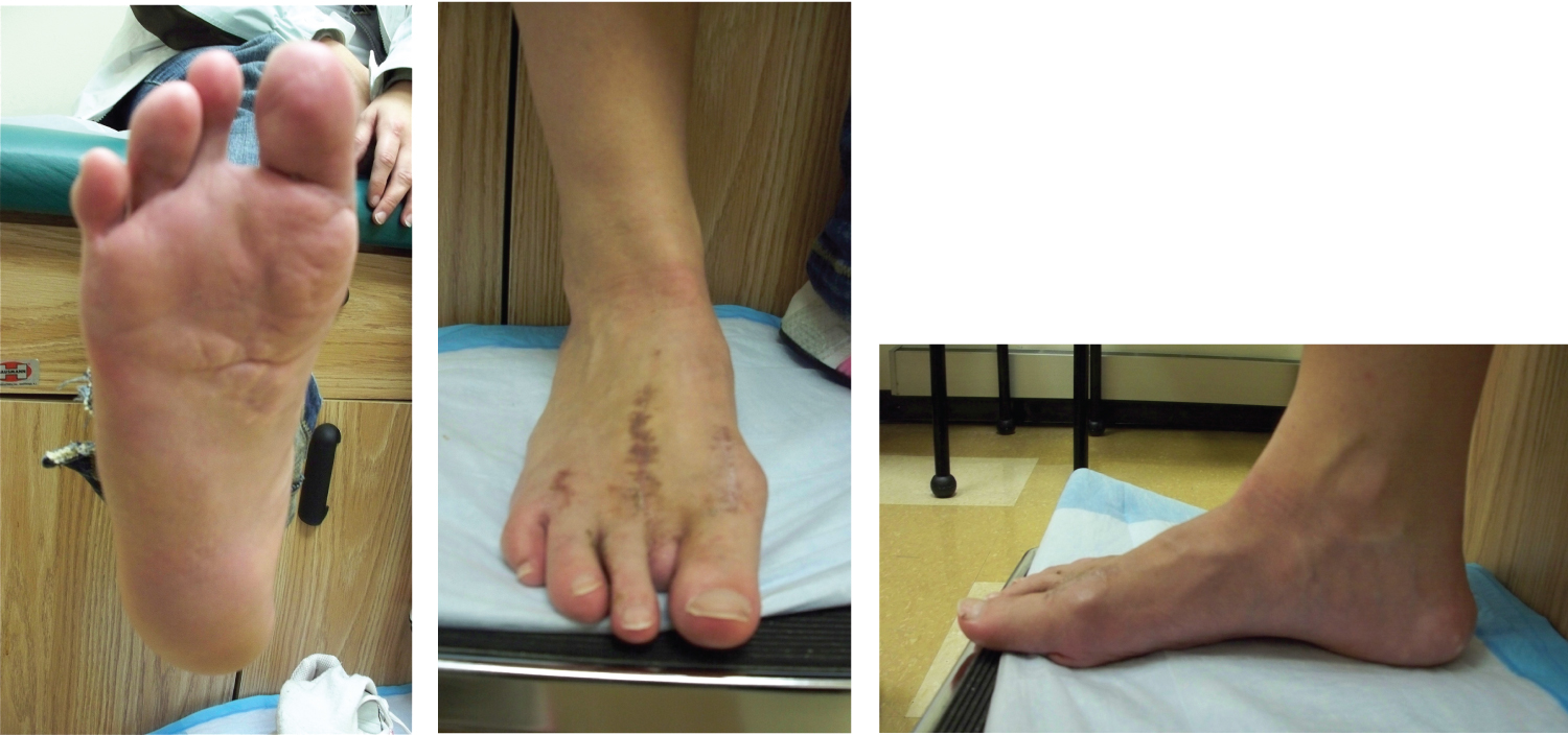 Radiation therapy with 700 cGy was administered to the right foot in one treatment session was performed following surgery in an attempt to prevent re-growth of the heterotopic bone. Post-operatively, she was placed in a short leg non-weight bearing cast until wound healing occurred uneventfully and the sutures were removed. Then, the second, staged surgery was performed on 21 days later during which several corrective measures were undertaken: 1) removal of heterotopic bone mass from the plantar aspect of the great toe which was causing essentially a cock up Deformity; 2) Correction of great toe deformity (lengthening the extensor hallucis longus and brevis tendons, releasing the tight dorsal capsular structures and percutaneous pinning); 3) Removal of heterotopic bone from plantar aspect of 3rd toe PIP joint area; and 4) Correction of 4th toe deformity (via extensor tendon lengthening, dorsal capsulotomy and percutaneous pinning). The patient was kept non-weight bearing until pins were removed four weeks post-surgery. She went on to resume her college classes and was able to resume a vigorous walking program, but not return to competitive soccer. One year later, the patient developed dorsal great toe metatarsophalangeal discomfort related to her hallux rigidus which progressively limited her daily walking activities. Surgery was performed 1 year later in the form of a right great toe cheilectomy and capsular release with removal of the medial eminence and the dorsal one-third of the metatarsal head. Four years after her second ray amputation, she is progressing well, graduating college, and participates regularly in exercise walking and other low-impact athletic activities. She was satisfied with her result. There is no evidence of re-growth of masses in the right foot. She is now able to wear a size 8 shoe on the right foot. The clinical appearance of her right foot is shown in (Figure 4).