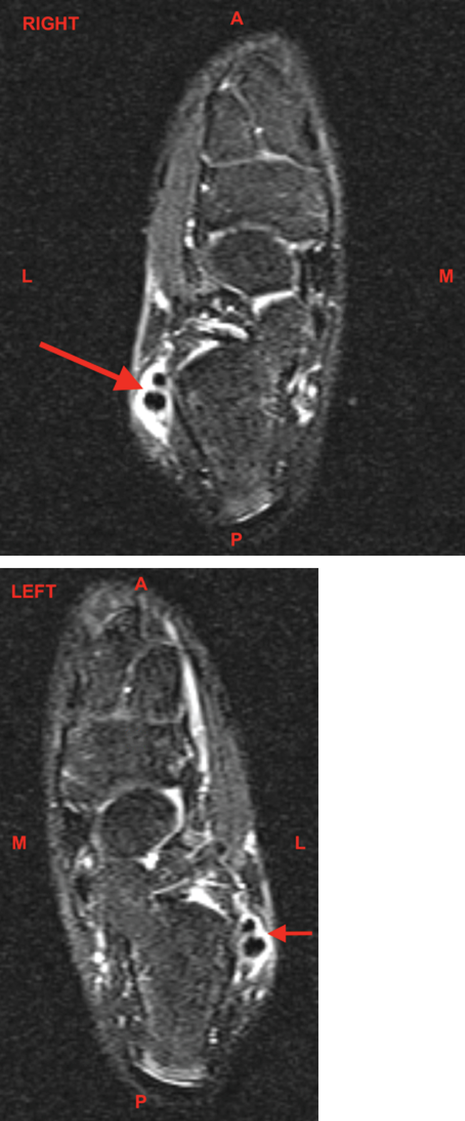 Figures 3 and Figure 4: MRI Ankle, Bilateral, Sagittal, T2 Fat Suppressed without contrast. The red arrows demonstrate the large amount of fluid signal intensity about the peroneus longus and brevis tendons indicative of tenosynovitis.
