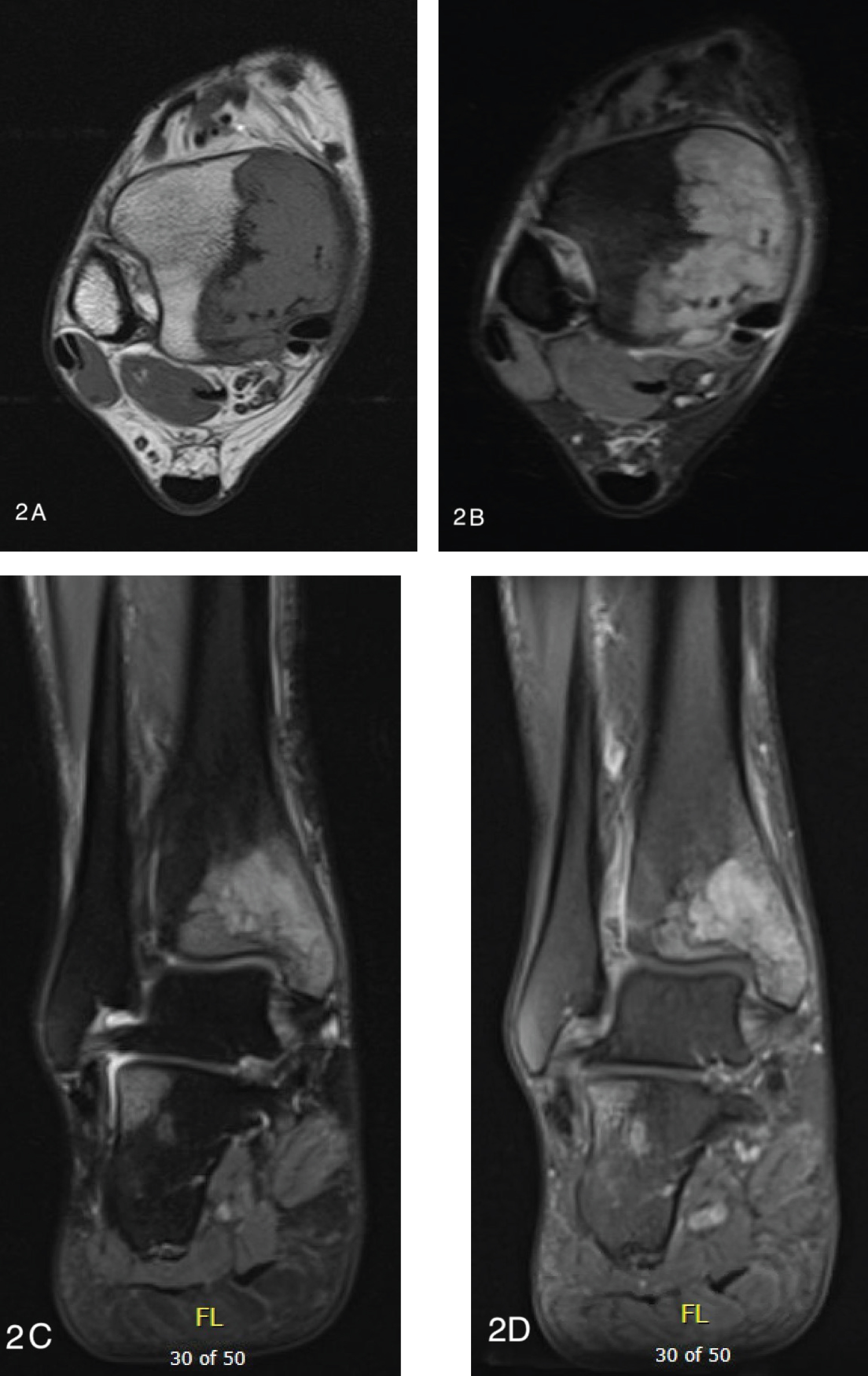 Conventional radiographs demonstrated a lytic bony lesion in the right medial malleolus (Figure 1). Magnetic resonance imaging (MRI) demonstrated a contrast enhancing marrow replacement lesion in the medial malleolus as well as the lateral calcaneus (Figure 2). Whole body bone scan demonstrated multiple lesions throughout the bilateral lower extremites (Figure 3).
