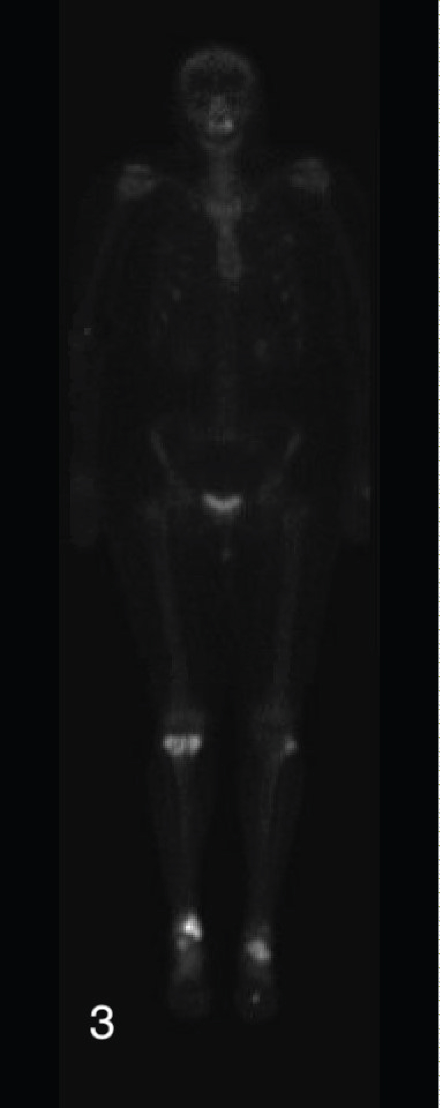 Figure 3: Whole body bone scan demonstrating multiple lesions in the bilateral lower extremities. View Figure 3