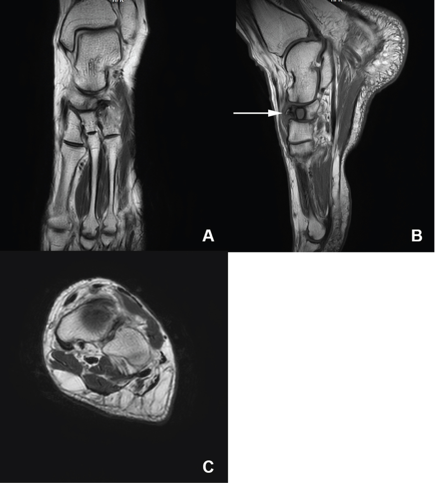 Because of the persistent pain, an MRI was performed, which showed bone marrow edema with low-signal areas on T1- and T2-weighted images in the marrow of the tarsal navicular bone, suggesting persistent osteonecrosis at the site of maximal pain (Figure 2).