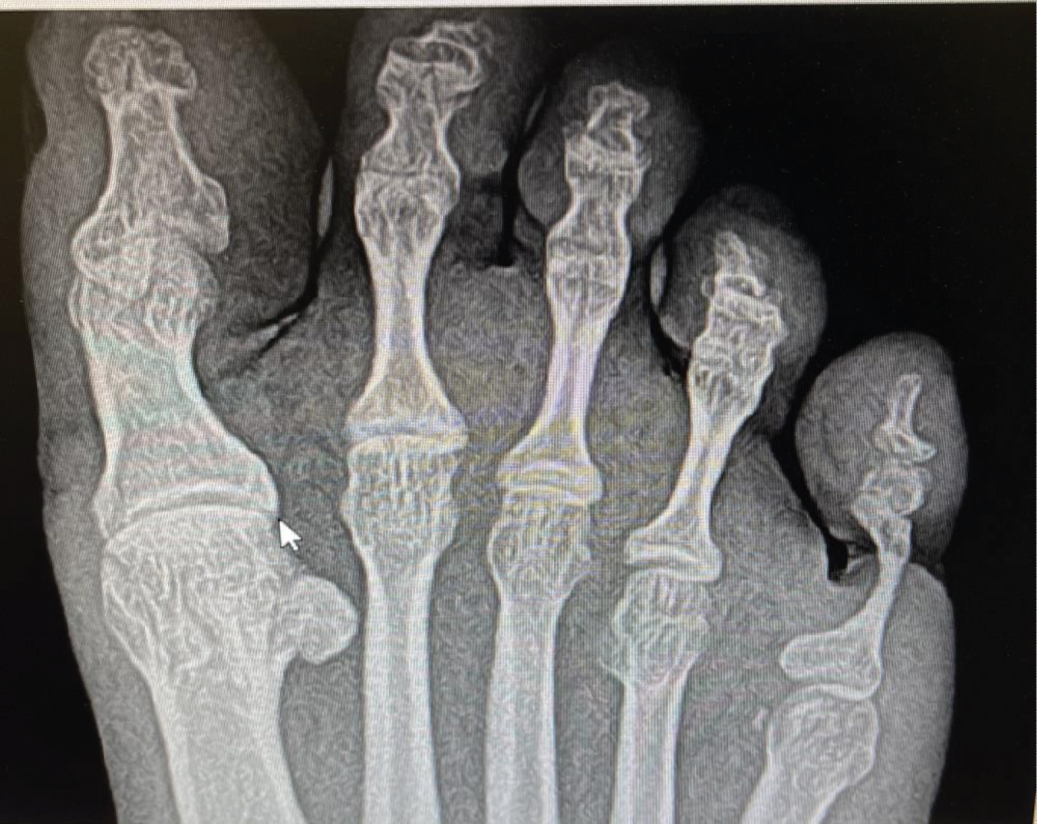 Radiographic imagining revealed narrowing of the shaft of the proximal phalanx distal to the groove marked rotation of the 5th toe, triangular appearance of the distal phalanx, with annular indentation in the soft tissues at the base of the 5th toe. MRI showed absence of the majority of the 5th proximal phalanx and distal to the base consistent frank bone destruction, with osteitis at the residual base of the phalanx, soft tissue irregularity and enhancement of the 5th digit surrounding the phalanges, no fluid collection.