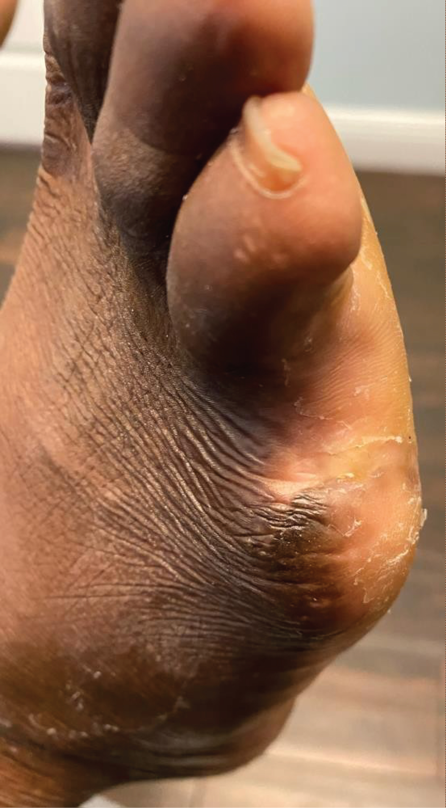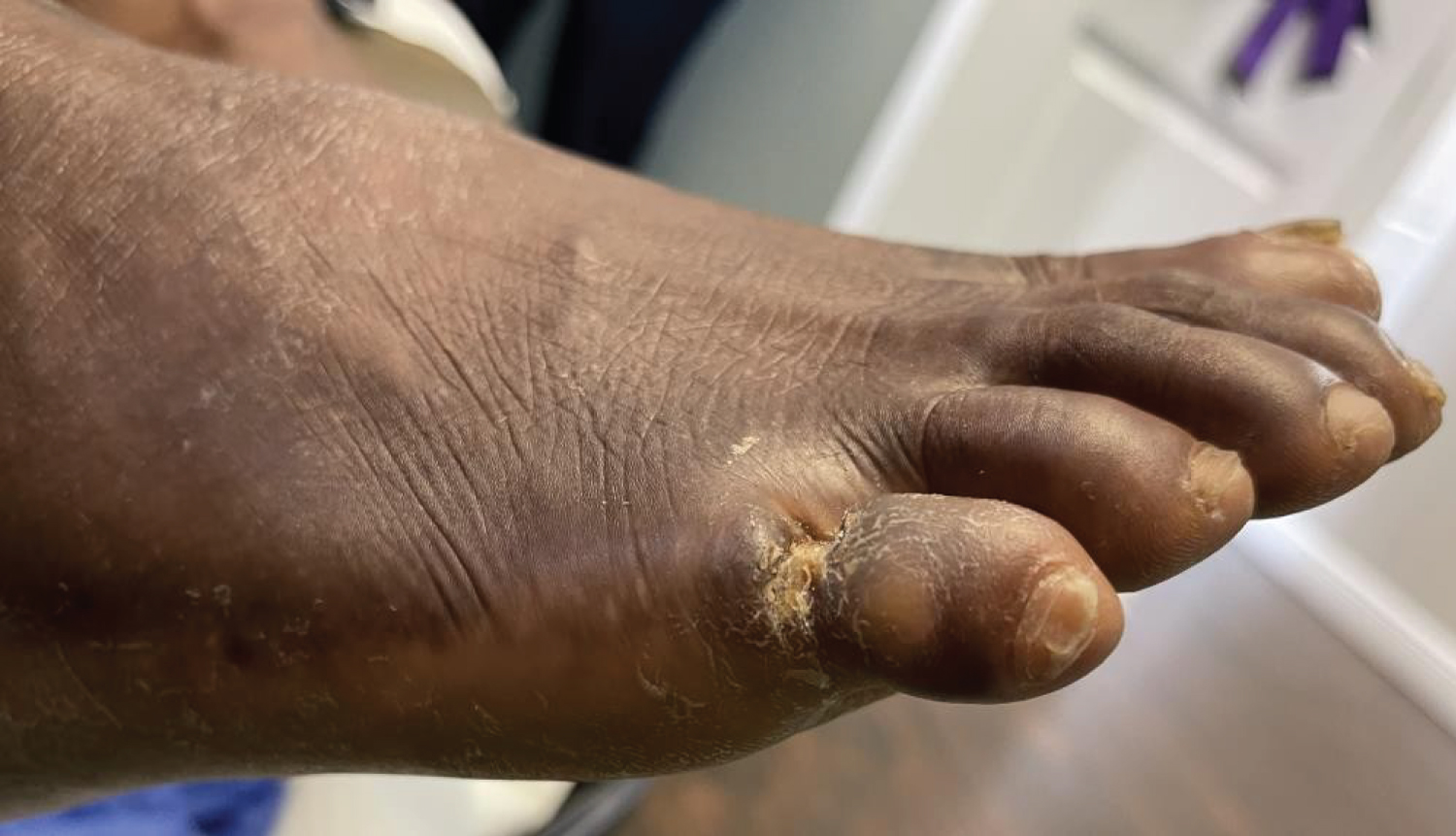 50 year old Haitian American male, no past medical history, presented to the clinic, one year ago noticed right foot swelling for a week and pain to his 5th toe with a fissure that began on the medial side of the base of the 5th toe, coinciding with plantar digital fold. The fissure never resolved he was treated with antibiotics prescribed by primary care for cellulitis that resolved the dorsal foot swelling. Over a course of six months, pain to the 5th toe has progressed the fissure had become a band of hyperkeratotic tissue spread more dorsal around the 5th toe so that the last part is the bridge of weight-bearing skin on its outer lateral plantar surface patient reported his 5th digit was shrinking circumferentially at the base of the proximal phalanx like the digits was being strangulated, and the distal phalanx was expanding in size with increased pain. The patient said members of his family in Haiti have amputated their toes with a knife. The patient denies trauma to the toe. Admits the pain from the toe has affected his gait and he is unable to wear closed-toe shoes, as pressure to the toe caused pain. No one in his family has had a similar condition. Physical exam showed at the base of the proximal phalanx a 1mm constrictive band of hyperkeratic tissue with edema of the distal 5th toe, the nail was found to face outwards by over 30 degrees, the patient was unable flex or extend his , the groove had ulcerated and celluiltis was present. He was started on a course of oral antibiotics after his initial consult due to celluilitis and the grove had ulcerated. Pulses to the right foot easily palpated +2 dp and +2 pt, right lower extremity skin temperature was warm, with lack of hair growth to bilateral lower extremities, the protective sensation was intact including the distal tip of the 5th toe.