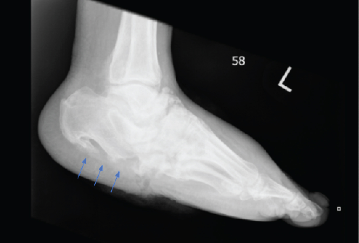 Figure 2: Example radiograph of Charcot destructive processes with a fractured calcaneal cortices. Arrows indicate disruption in plantar calcaneal cotices. View Figure 2