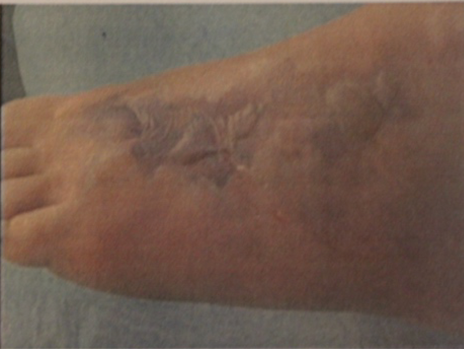 Figure 3: plastic reconstruction with an approximately 10 cm split-thickness skin graft covering the lateral dorsum of the foot and proximal lower leg. View Figure 3
