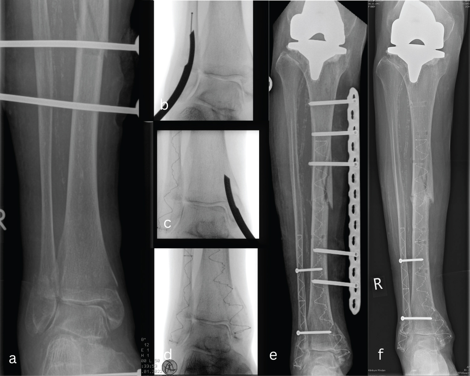 Figure 1: (a) Peri-implant tibial shaft fracture by coexisting bimalleolar ankle fracture primarily fixed with an external fixator; (b-d) Chronological steps for the minimally invasive technique with the photodynamic bone stabilization system (IlluminOss® system) to stabilize the fibula and tibia; (e) A temporary transverse osteosynthesis with angular stable plate and screws in the form of an external fixator was performed to increase stability; (f) 2 months postoperatively shows a consolidated fracture. View Figure 1