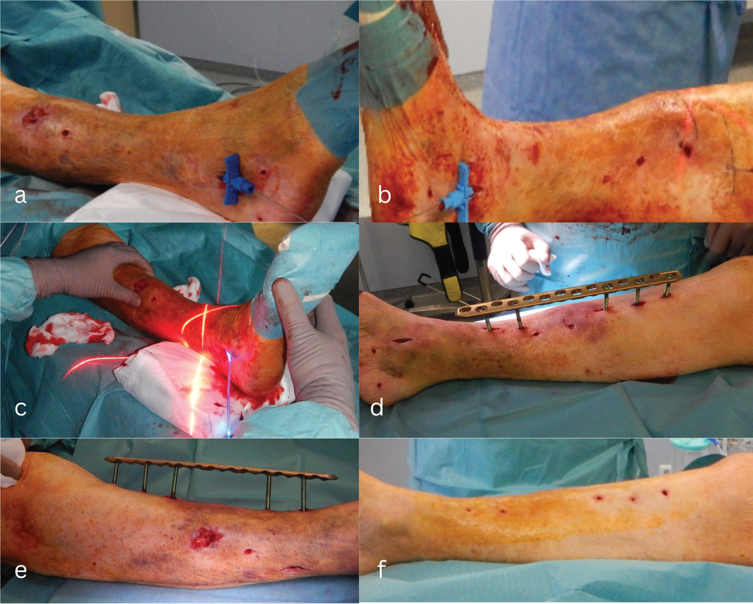 An 80-year-old female patient with severe cardiopulmonary disease (NYHA 4), end-stage renal disease, severe osteoporosis and a coexisting total knee arthroplasty fell on her side and sustained an unstable bimalleolar ankle fracture. Due to the major comorbidities and the compromised soft tissue condition, we decided to treat the fracture primarily with an external fixator. Three weeks later, the patient fell again and presented to our emergency department with severe pain in the same leg. On physical examination, the Schanz screws were loose both proximally and distally. The soft tissue conditions on the lateral and medial sides were compromised and undermined by hematoma. The radiograph showed a peri-implant long-segment spiral comminuted fracture at the tibia shaft at the level of the proximal Schanz screw. Due to the critical soft tissue condition, the severe osteoporosis, and the pre-existing knee arthroplasty which in turn limits the antegrade treatment with intramedullary nail fixation, we opted for a minimally invasive technique utilizing a photodynamic bone stabilization system (IlluminOss® system) to stabilize the fibula and tibia; temporary transverse osteosynthesis with angular stable plate and screws in the form of an external fixator was also planned to increase stability. The patient gave her written consent for surgery.