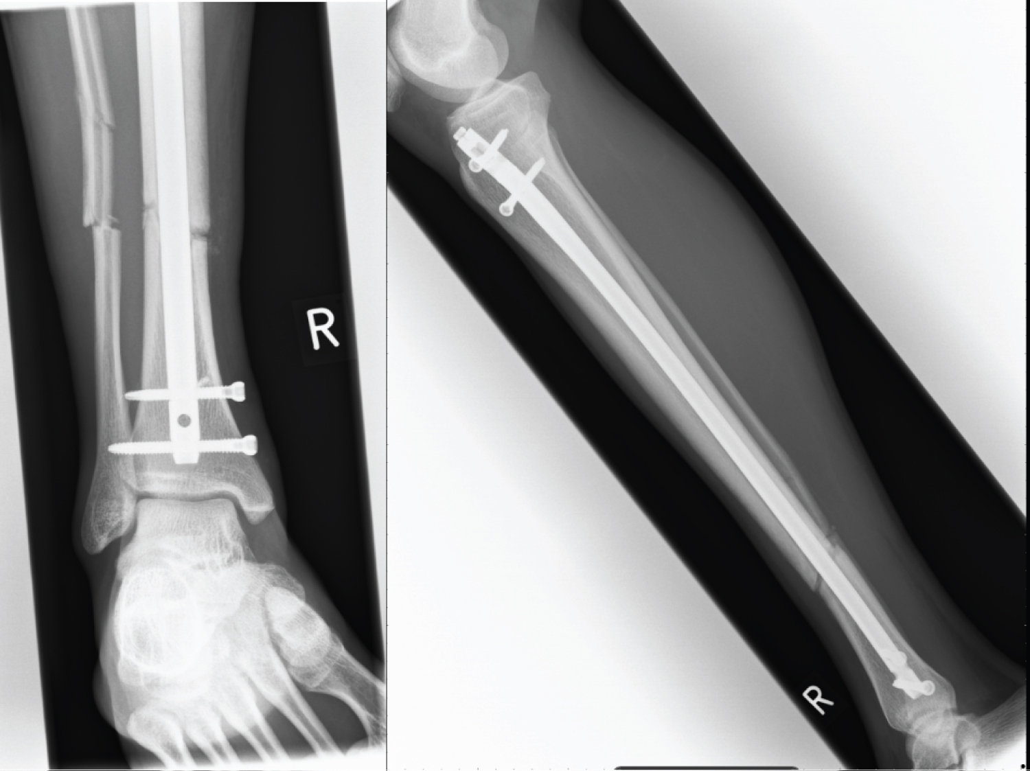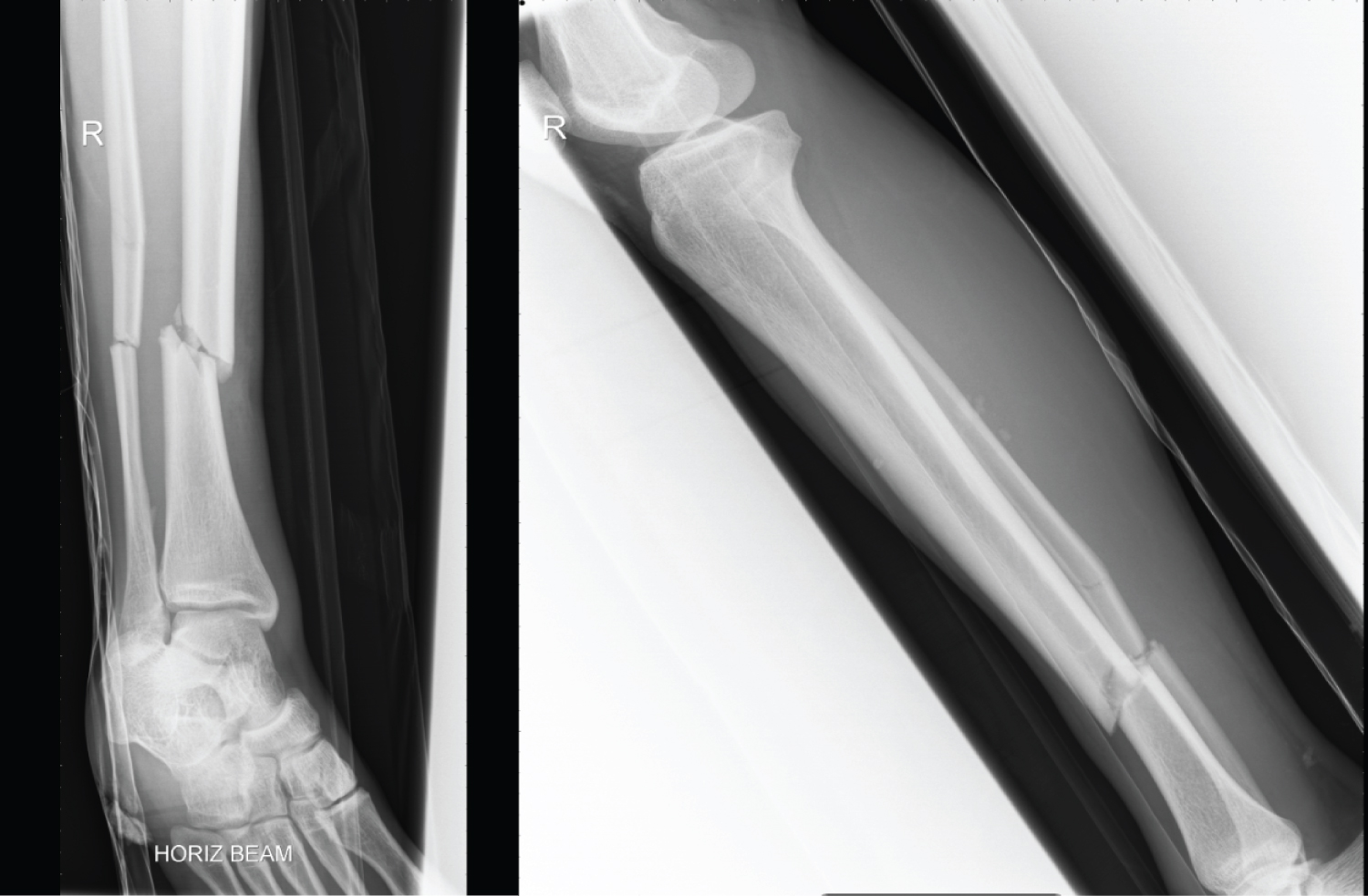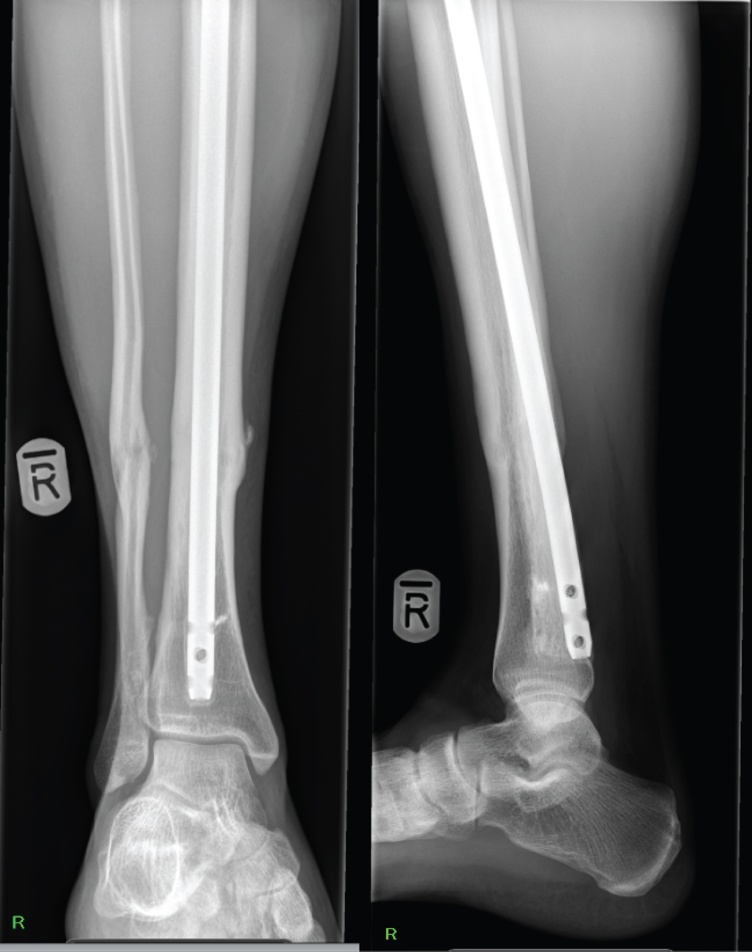A 20 year old man suffered a closed, oblique fracture of his right tibial diaphysis at the junction of the middle and distal third with an associated fibula fracture whilst playing football (Figure 1). His tibia was stabilised with an antegrade, reamed, intramedullary nail and proximal and distal bolts, on a planned trauma list. The position on intraoperative fluoroscopy and post-operative radiographs show an appropriate reduction and position of the nail (Figure 2). Immediate weight bearing as pain allows was commenced post-operatively and after clinical and radiographic union, was permitted to return to sport and work as a crane driver.