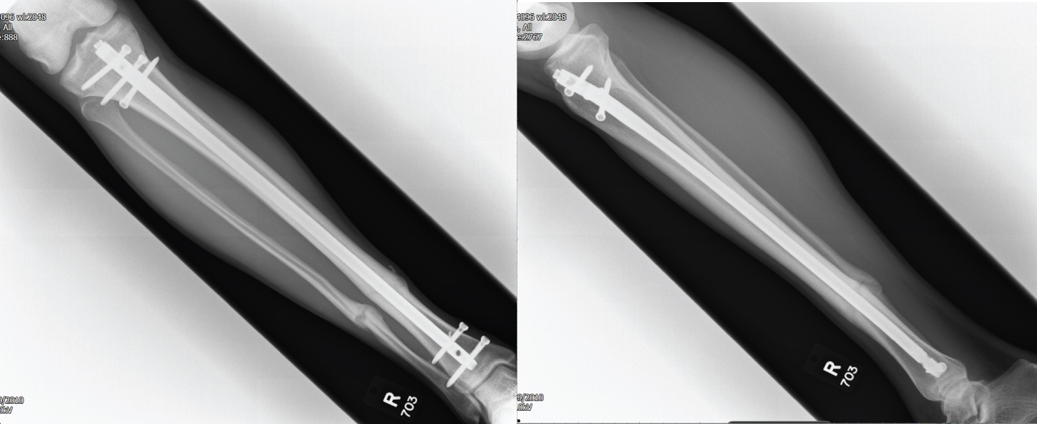 1 year post-operatively the prominence of the distal locking bolts caused pain when kicking a football and he was duly listed for removal of the distal bolts only 12 months post-operatively (Figure 3). Following recovery from bolt removal, a gradual return to football was allowed. Over the subsequent 12 years the patient suffering an insidious onset progression of pain in the distal tibial, particularly in the morning and whilst playing sport, prompting referral through to the orthopaedic services for follow-up 13 years post-operatively.