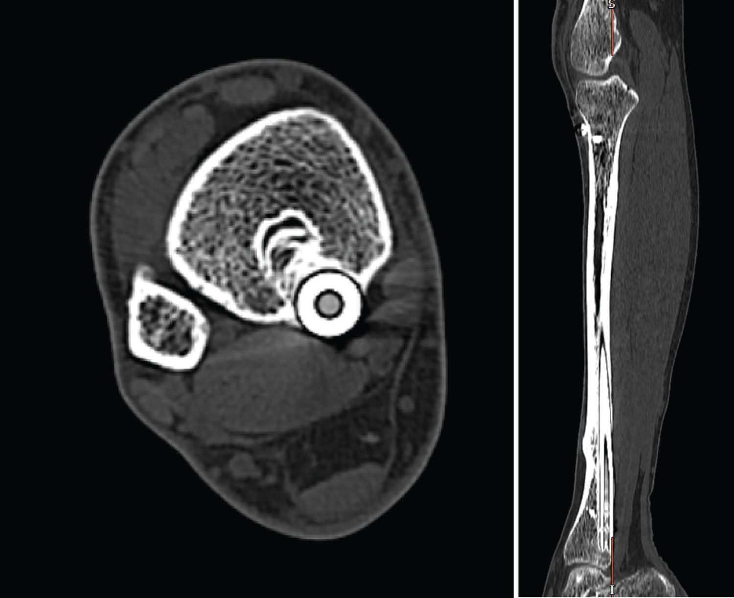 On review, the patient's wounds had healed and there was no evidence of infection or swelling and the fracture site remained non tender with no evidence of motion or erythema. Mildly reduced dorsiflexion and an antalgic gait remained the only positive findings on examination. Radiographs taken following clinical review demonstrated distal nail protrusion into the deep posterior compartment posteriorly, with appropriately sited proximal nail with two bi-cortical bolts in-situ (Figure 4). Blood tests to investigate for infection, Bone profile and an ESR returned within normal limits, other than an elevated ALP suggesting higher than normal bone turnover. A CT scan confirmed migration through the posterior cortex distally abutting the belly of flexor hallucis longus (Figure 5).