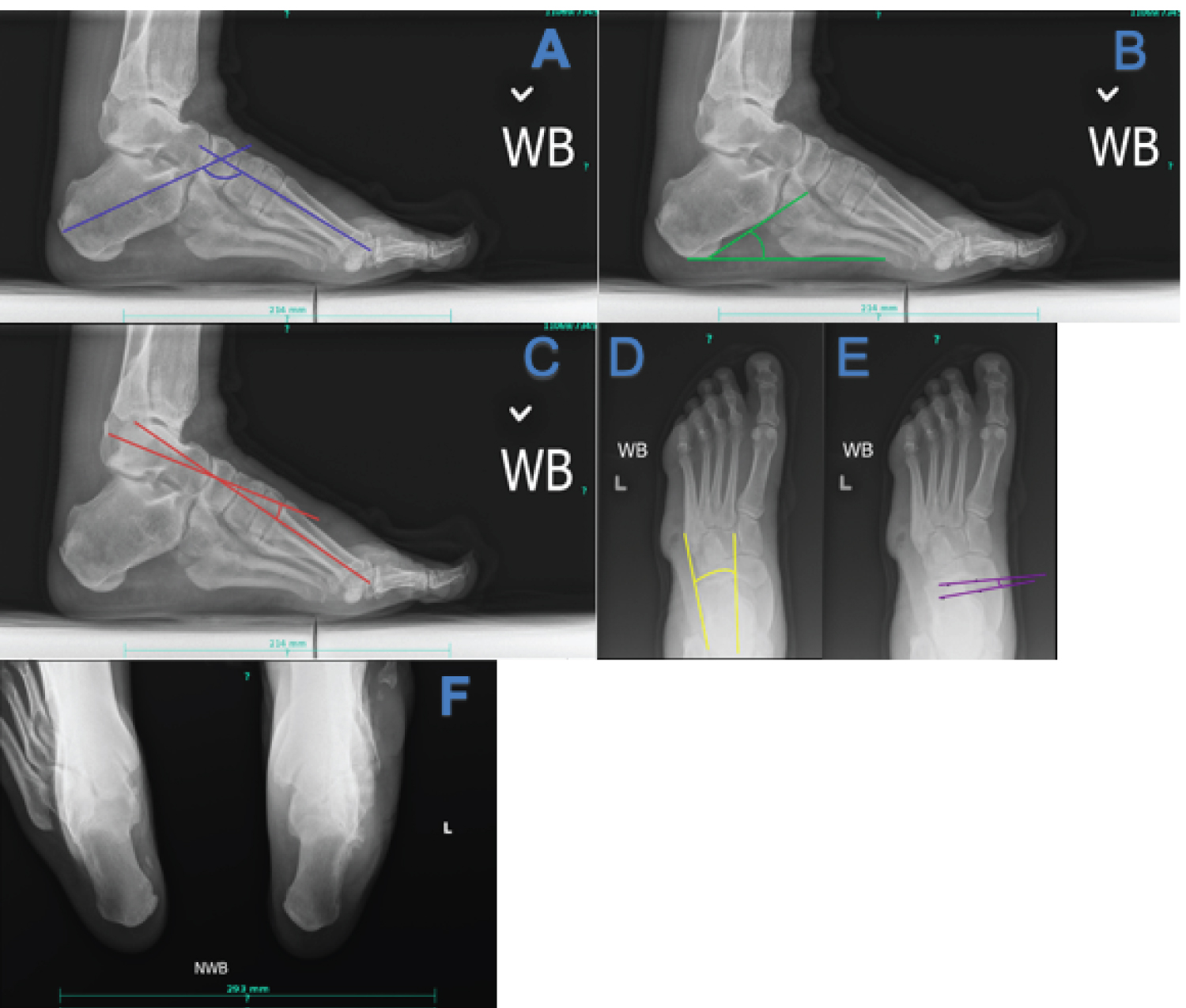 Standard views of the feet were obtained along with calcaneal axial view, most notable for varus attitude of the calcaneus, increased inclination of the calcaneus, increased lateral Meary's angle, and increased talar coverage (Figure 5). This all correlated clinically with the cavovarus deformity noted.