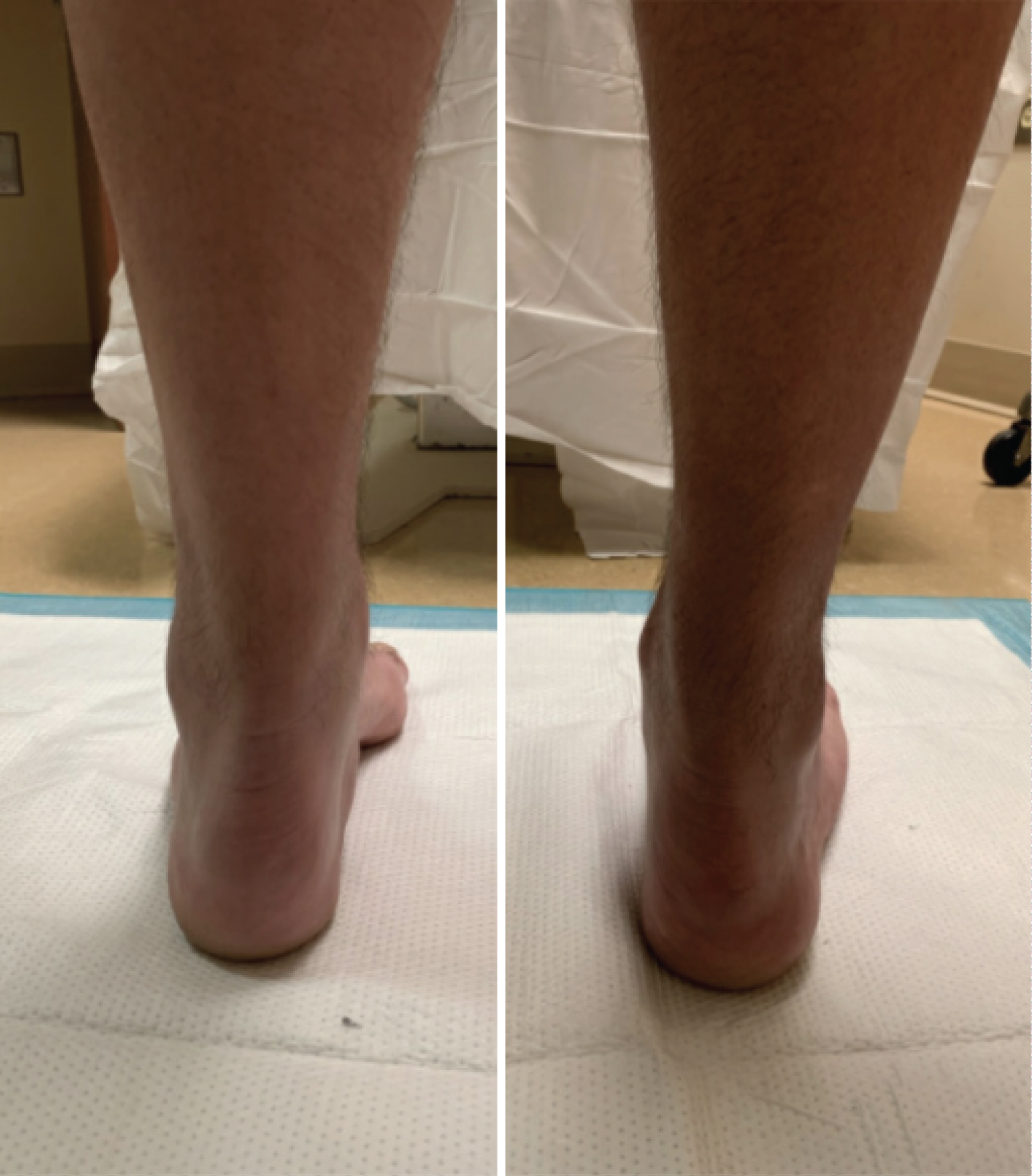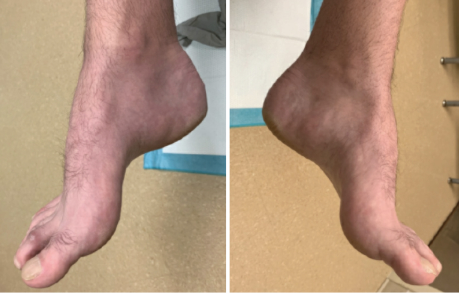 On physical examination there was a lack of epicritic sensation to the feet bilaterally, generalized tenderness to both feet, this was most notable in the plantar arches along the prominent plantar medial band of the plantar fascia. Notable cavus foot type bilaterally with the left slightly worse than the right. Resting calcaneal stance revealed a varus attitude of the calcaneus on both feet, which was non-reducible with the Coleman block test. Manual muscle testing revealed weakness in DF, PF, inversion, eversion with 4/5 strength throughout, with notable mild peroneal muscle fatigue. Gait analysis demonstrated abnormal and rapid subtalar joint supination during initial heel strike and supinated position of the STJ throughout the stance phase of gait. There was no ankle instability, peroneal tendon pain, and no pain laterally on the calcaneus over the peroneal tubercle (Figures 2, Figure 3 and Figure 4: Clinical Images).