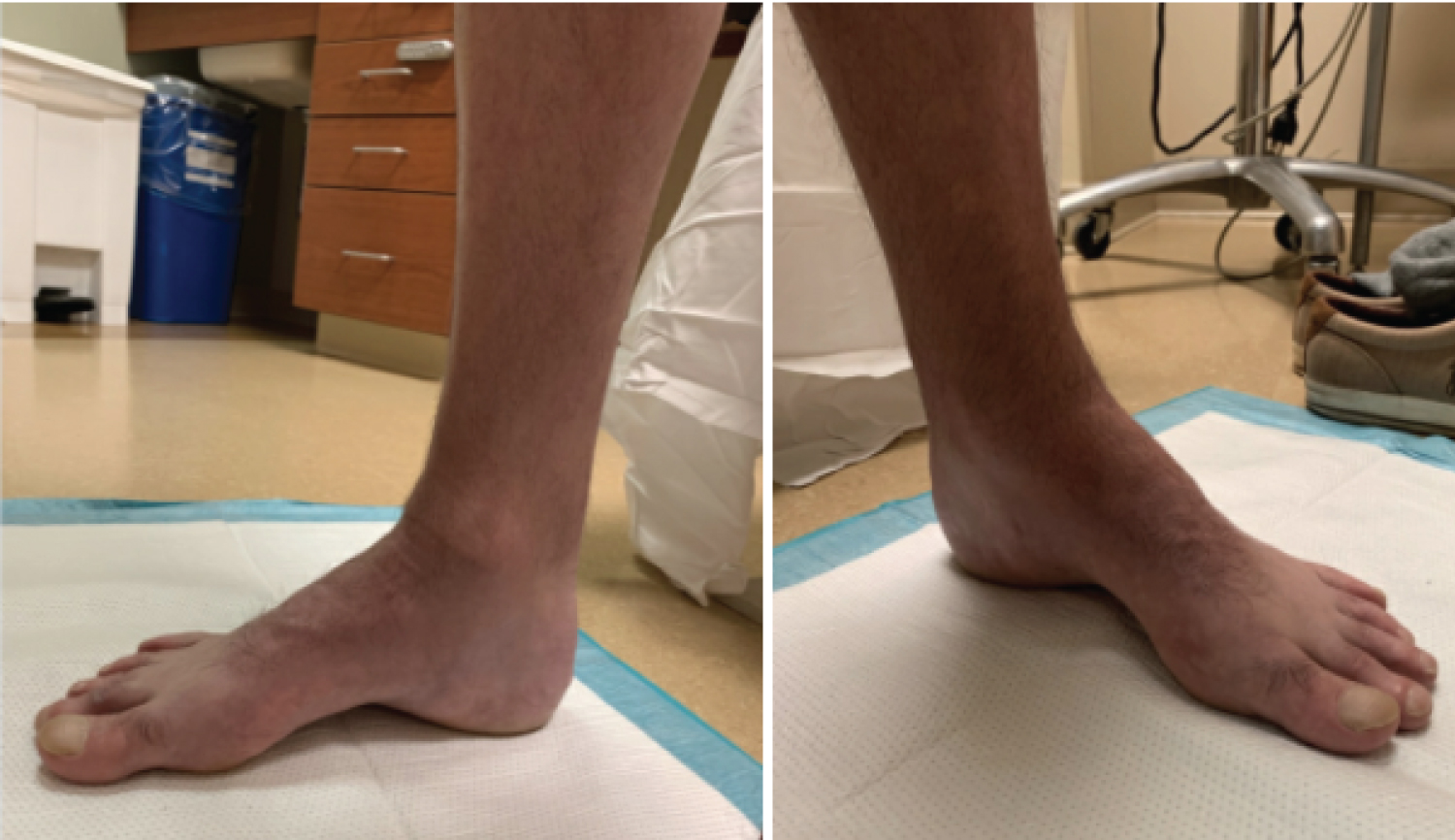 The patient is a 52-year-old male police officer with a past medical history of Charcot-Marie-Tooth disease, current 1 pack per day smoker, history of left C5-7 anterior cervical discectomy with fusion several years ago, and peripheral neuropathy who presented for a second opinion of bilateral foot pain. He was diagnosed previously via EMG and NCV with CMT. Subjectively, the patient states that he progressively has developed severe cavus deformities to both of his feet and has had to modify his activity level due to pain and weakness. Denies any familial history of high arches or diagnosis of CMT. He has failed conservative treatment including orthotics, corticosteroid injections, as well as formal physical therapy. He takes gabapentin 1200 mg at night for his neuropathy. He states that the pain that he has in his feet feels different from his baseline neuropathic discomfort and describes it as more throbbing, aching, and stiffness.