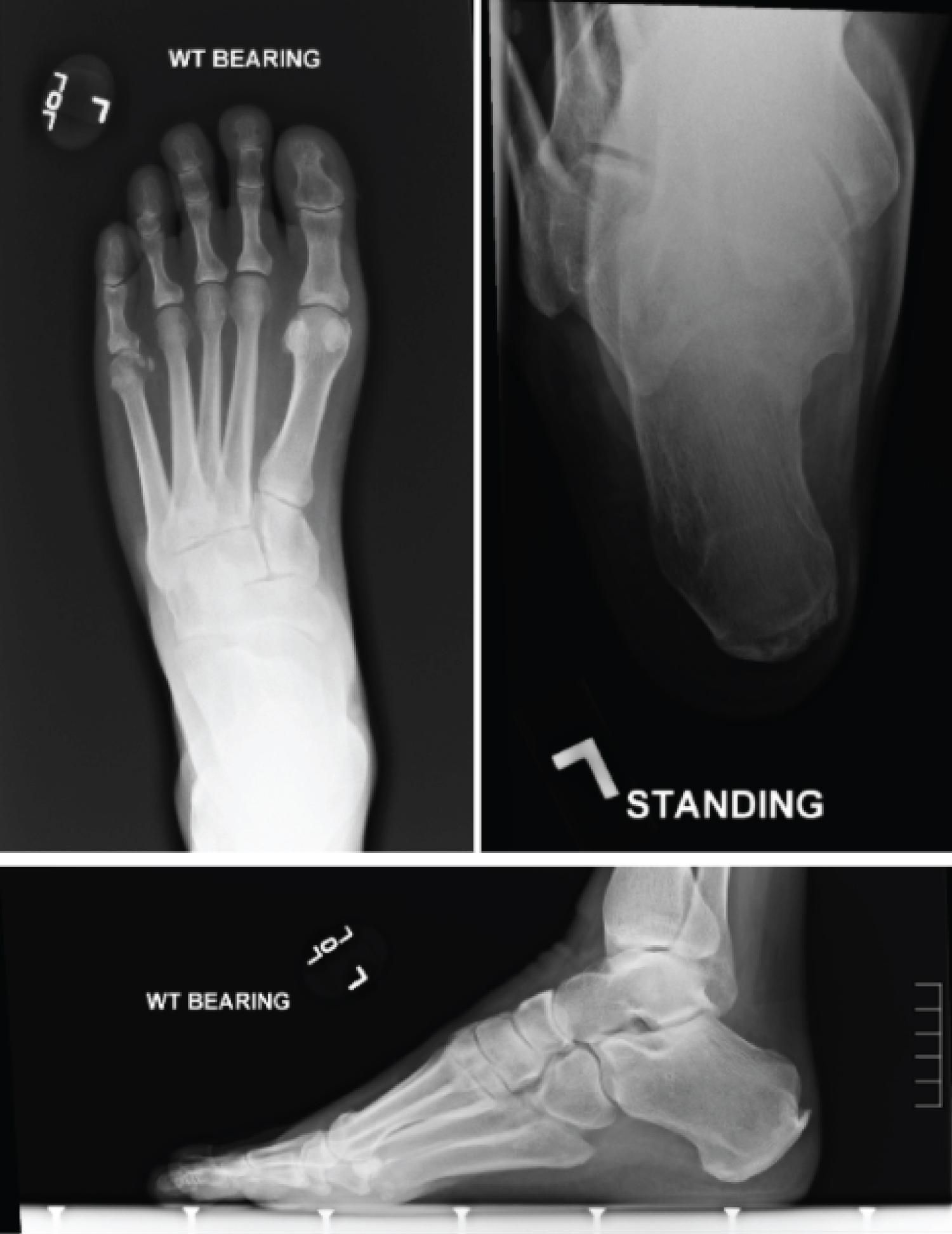 Figure 5: Radiographs of a patient with CMT. Top left: weight bearing AP view, top right: weight bearing calcaneal axial view, bottom: Weight bearing lateral view. View Figure 5