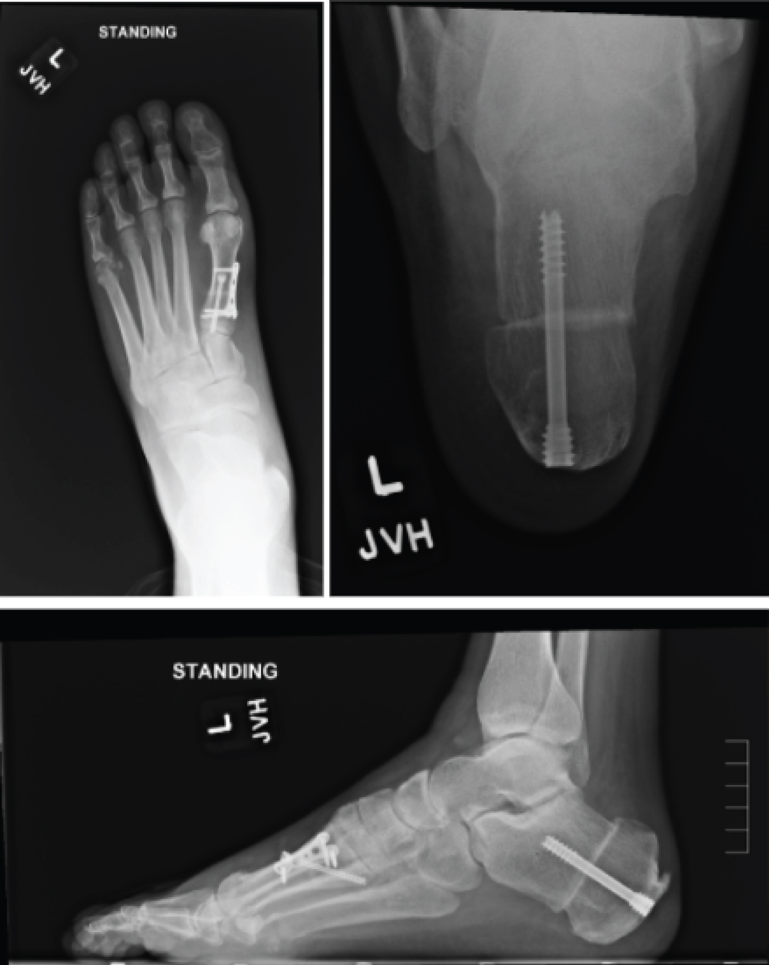 After medical optimization, the patient's left foot was surgically corrected with the following procedures, respectively: Steindler stripping, Dwyer, posterior tibial tendon transfer to lateral cuneiform, and dorsiflexory wedge osteotomy of the 1st metatarsal. The patient was placed into a posterior splint and was made non-weight bearing. The patient was transitioned to a CAM boot at the first postoperative visit, however remained non-weight bearing for a duration of 6 weeks. After postoperative week 6, radiographs of the foot were taken and demonstrated union of osteotomy sites (Figure 6). The patient was then started with gradual weight bearing, transition out of the CAM boot, and formal physical therapy.